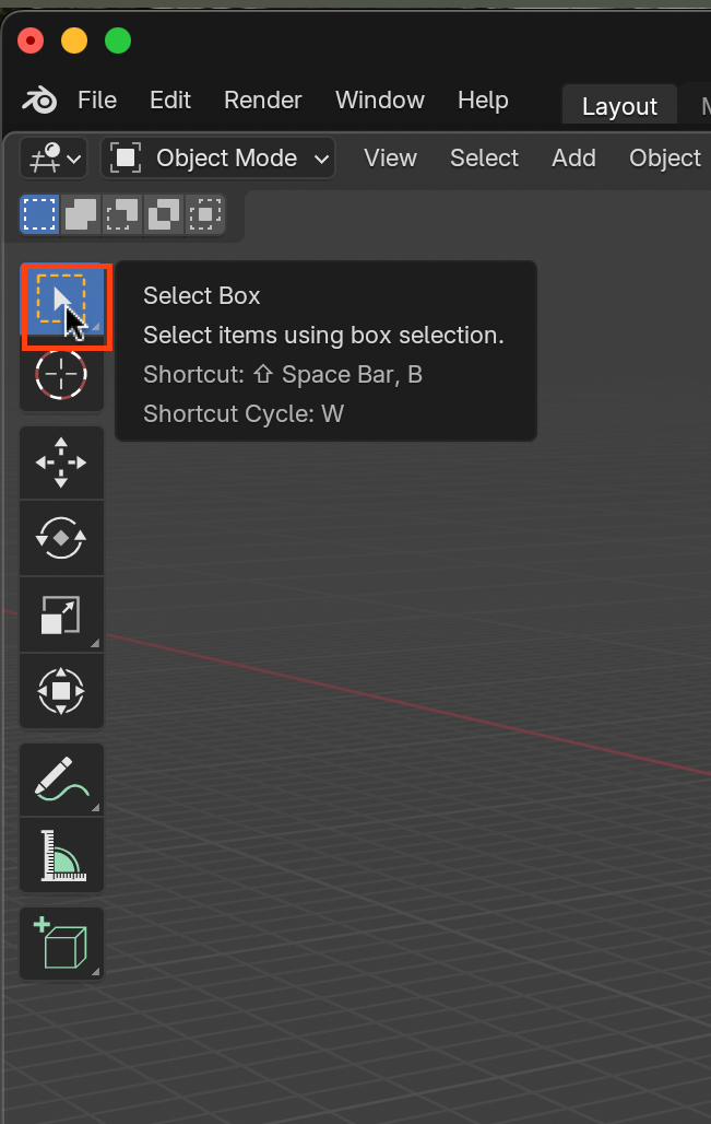기본은 박스 선택이며, 드래그해서 오브젝트를 선택할 수 있습니다.