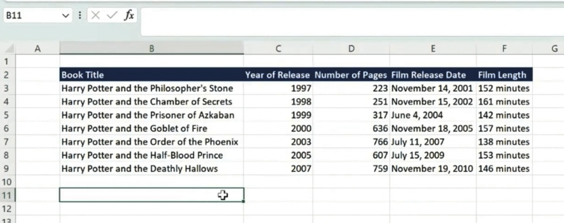 “J.K. 롤링이 쓴 해리 포터 책 목록을 표로 정리해줘. 책 출간 연도, 페이지 수, 영화 개봉일, 영화 러닝타임도 함께.”