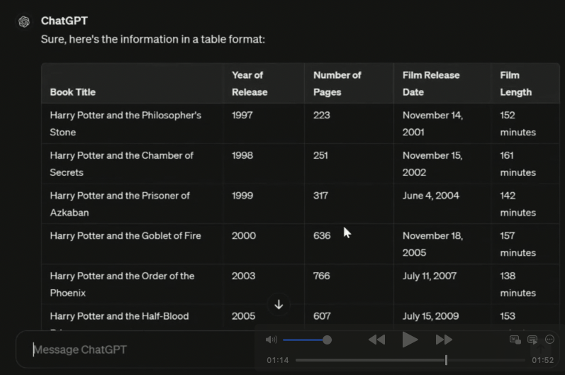 또한 ChatGPT에게 응답을 표로 정리해서 제공해달라고 요청할 수도 있습니다.