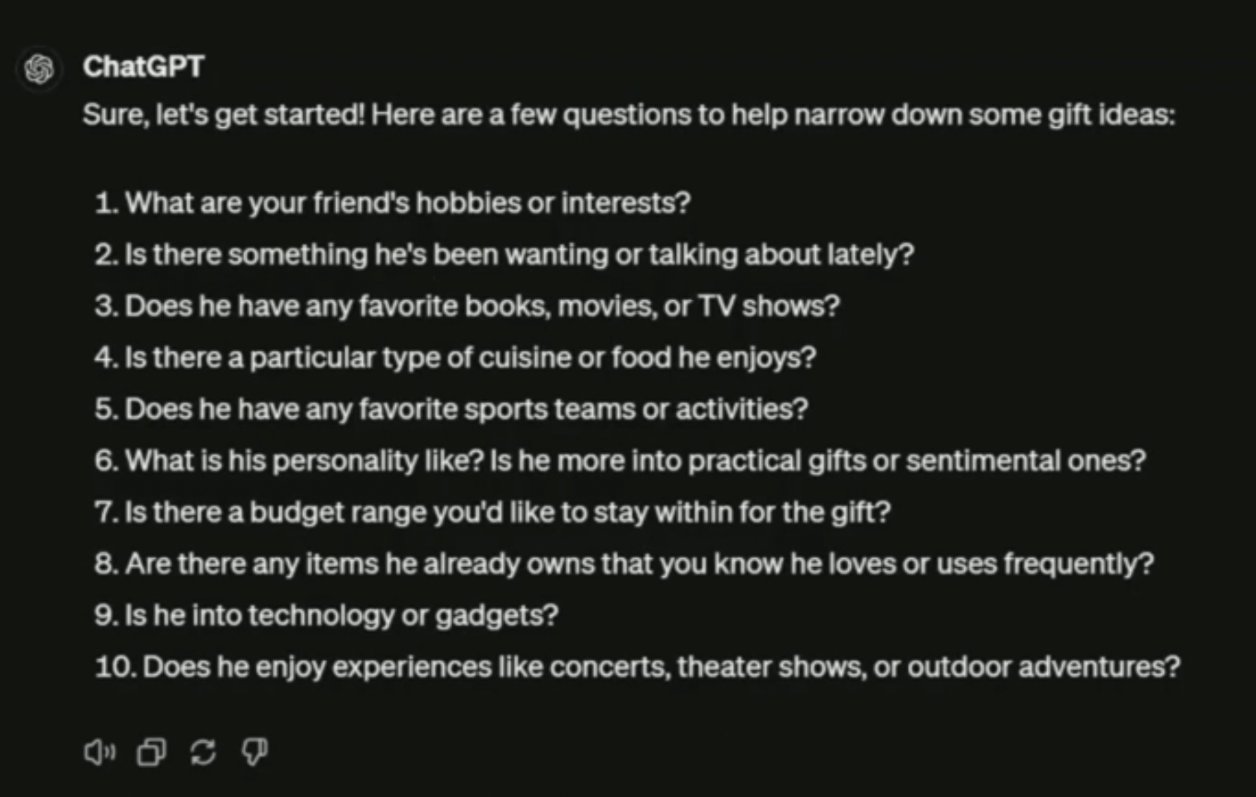 이 중 일부 질문에만 답해도 충분한 정보를 바탕으로 맞춤형 선물 아이디어를 제시해 줍니다.
