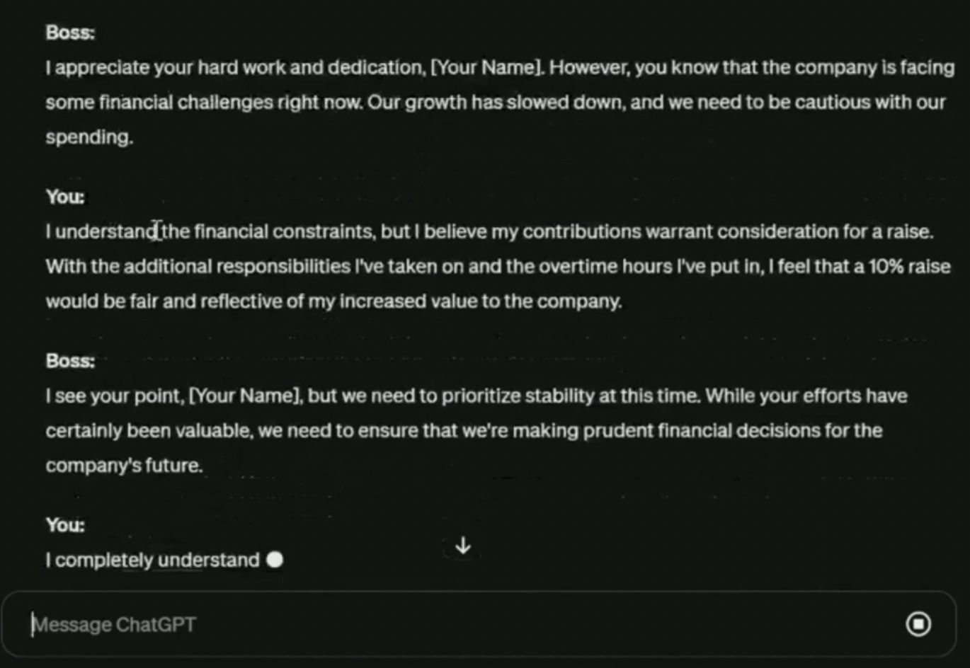 “나는 초과근무도 많이 했고 평가도 좋았기 때문에 10% 연봉 인상을 원해. 하지만 상사는 회사 재정이 어렵고 성장률이 낮다고 말할 것 같아. 우리 대화를 시뮬레이션 해줘.”
