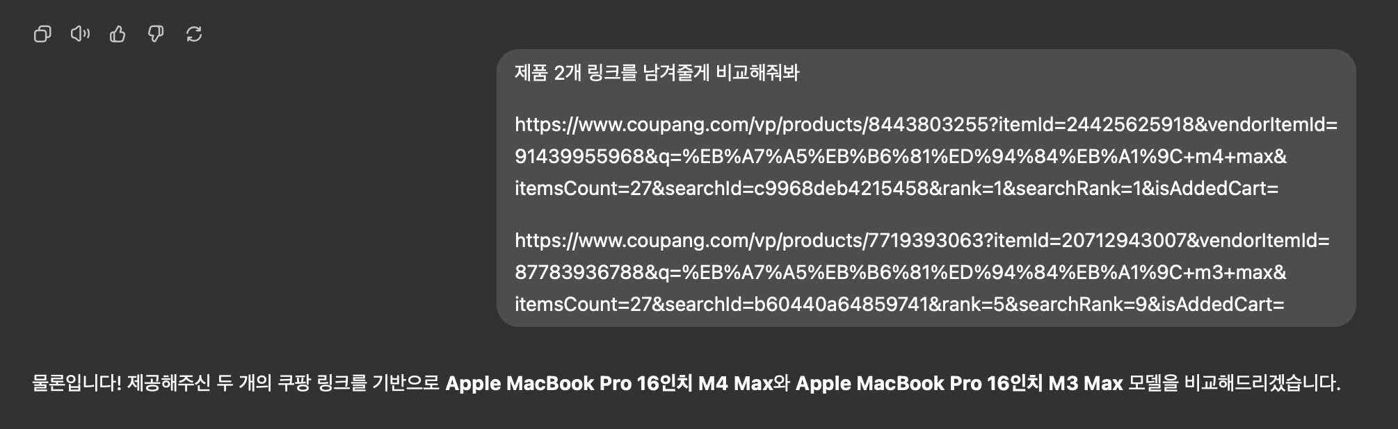 - 비교하고 싶은 제품의 링크를 복사해서 ChatGPT에 보내기