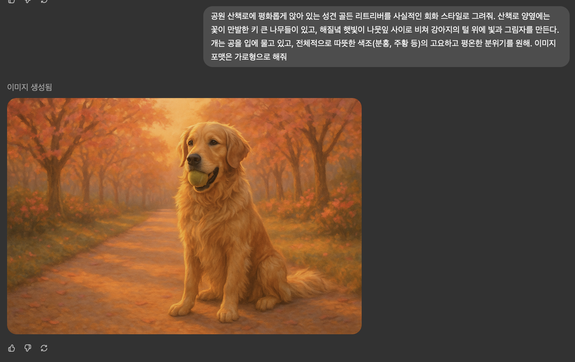 “공원 산책로에 평화롭게 앉아 있는 성견 골든 리트리버를 사실적인 회화 스타일로 그려줘. 산책로 양옆에는 꽃이 만발한 키 큰 나무들이 있고, 해질녘 햇빛이 나뭇잎 사이로 비쳐 강아지의 털 위에 빛과 그림자를 만든다. 개는 공을 입에 물고 있고, 전체적으로 따뜻한 색조(분홍, 주황 등)의 고요하고 평온한 분위기를 원해. 이미지 포맷은 가로형으로 해줘.”