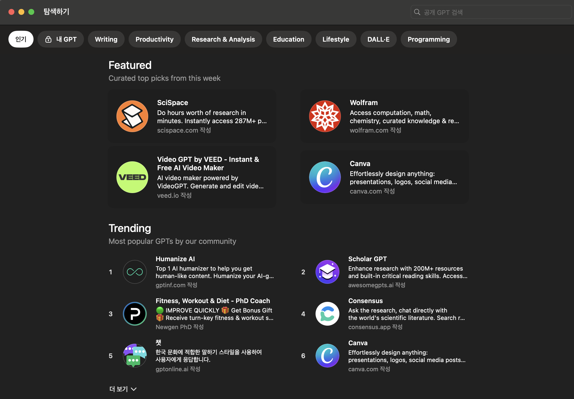 먼저, GPT 스토어로 이동하는 방법을 보여드리겠습니다. 정말 간단합니다. 사이드바를 열고 “탐색(Explore)“에서 “GPTs”를 클릭하면 됩니다. 그렇게 하면 바로 GPT 스토어로 이동하게 되며, 모든 GPT들과 그들의 애플리케이션을 볼 수 있습니다.