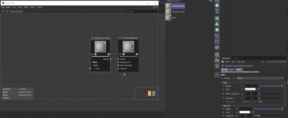 • 설정을 마친 후 머티리얼 매니저에서 새로운 Arnold Standard Surface 재질을 생성하면, 더 이상 구형 에디터가 아닌 C4D 기본 노드 에디터에서 셰이더 그래프가 열립니다.