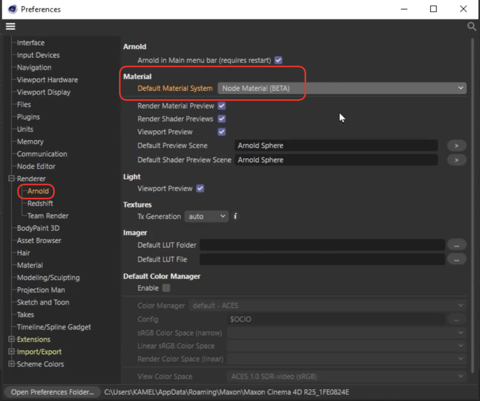 - 설정 변경: Default Material System 항목을 'Arnold Material'에서 **'Node Material'**로 변경합니다.
