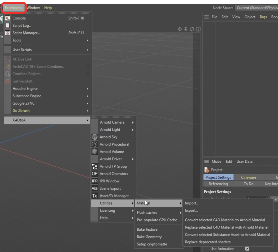- Extensions 메뉴: Arnold 카메라, 라이트, 스카이(Sky), 볼륨, IPR 창 등 주요 도구들을 생성하고 관리할 수 있습니다.