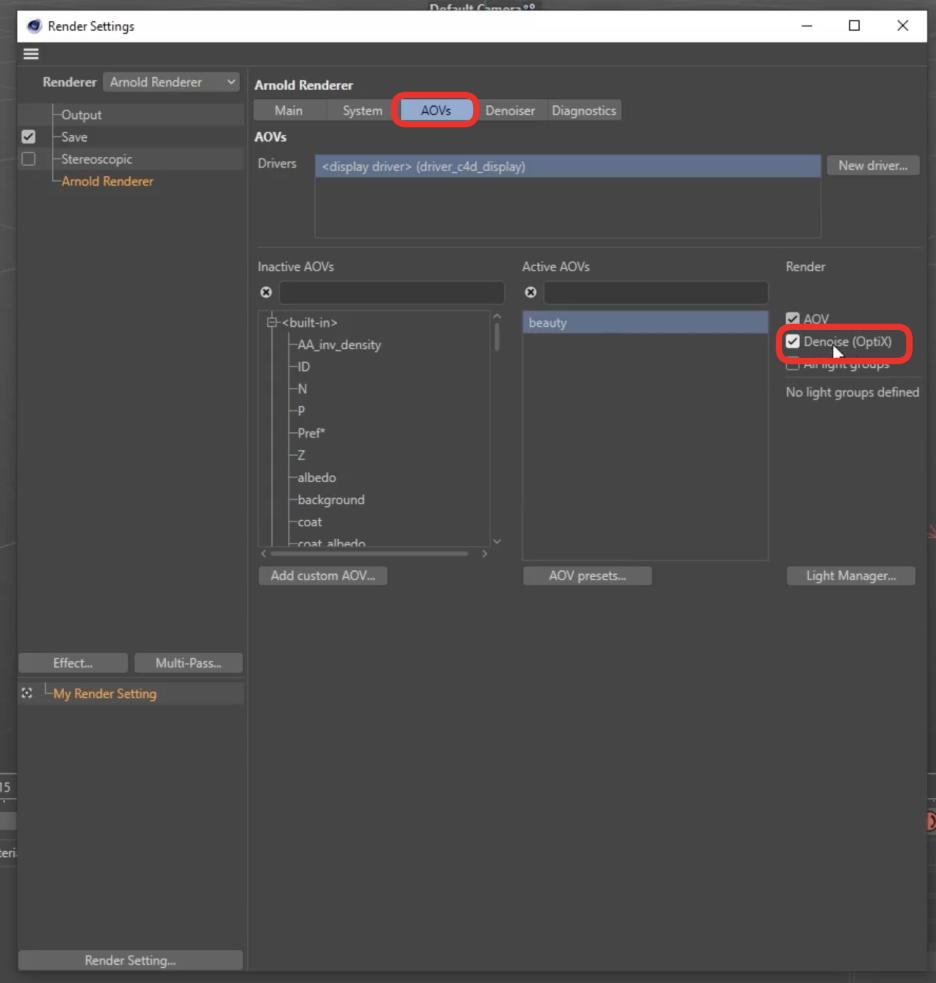 - Denoiser (노이즈 제거): * Arnold Denoiser: 렌더링이 끝난 후 처리하는 고품질 포스트 프로세스 디노이저입니다.
