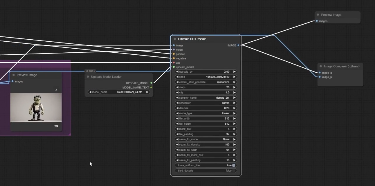 추가로 Compare Node도 넣어서 원본 이미지와 업스케일된 이미지를 비교할 수 있도록 합니다:
