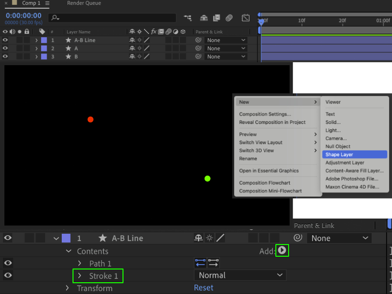 To demonstrate how to use this, I have prepared some layers. First, I create two Shape layers in the form of circles. Then, I add a new empty Shape layer and apply a Stroke to it. This results in a total of three prepared Shape layers.