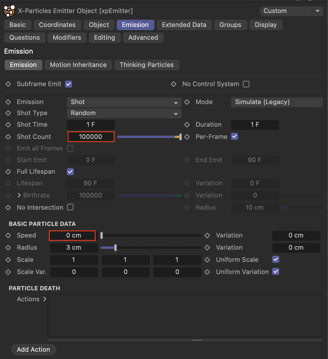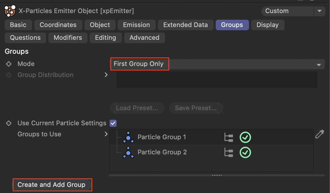 1. **xpEmitter Groups**: 두 개의 새로운 그룹을 추가합니다. 첫 번째 그룹만 모드로 설정하여 모든 입자가 태어나면 그룹 1에 배치됩니다. 그룹 2는 현재 아무것도 하지 않습니다.