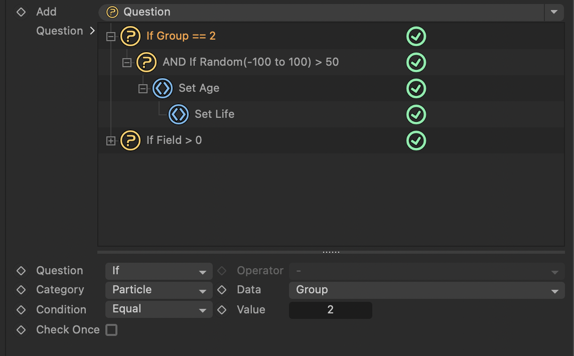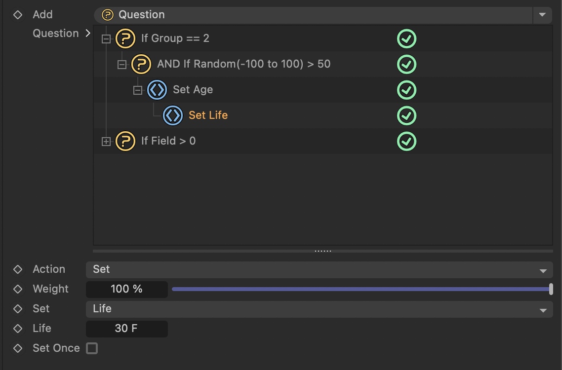 1. **nxQuestion**: 그룹 2에 있는 입자들에게 랜덤한 숫자를 부여하고, 그 숫자가 50보다 클 때 입자의 나이를 0으로 설정하고 수명을 설정합니다. 이를 통해 입자들이 균일하게 소멸하지 않고, 더 자연스럽게 소멸하는 효과를 얻을 수 있습니다.