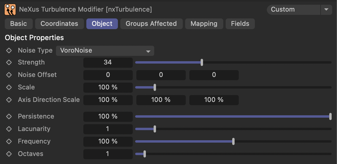 2. **nxFollowGeo**: 그룹 1만 영향을 받도록 설정합니다. 따라서 현재 모든 입자가 그룹 1에 있으며, Follow Geo의 영향을 받고 있습니다.