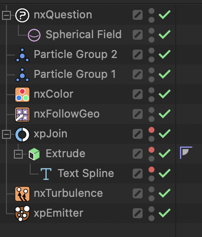 우리 씬에는 텍스트 객체에서 입자가 방출되고, 이 입자들이 넥서스의 Follow Geo를 사용하여 텍스트 표면을 따라 이동하는 시뮬레이션이 있습니다. 강한 난류가 입자들에게 멋진 난류 움직임을 부여하고 있습니다. 이제 입자들을 자유롭게 하고, 그들이 소멸하도록 만들고 싶습니다.