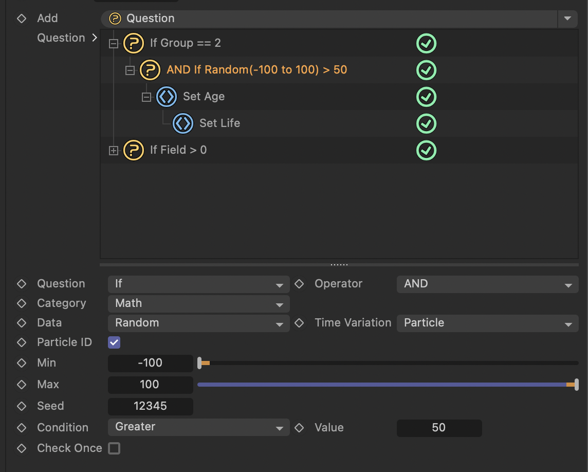 2. **랜덤성 추가**: 수학 노드를 사용하여 입자들에게 랜덤한 숫자를 부여하고, 그 숫자가 특정 값보다 클 때 입자의 나이를 0으로 설정하고 수명을 설정합니다.