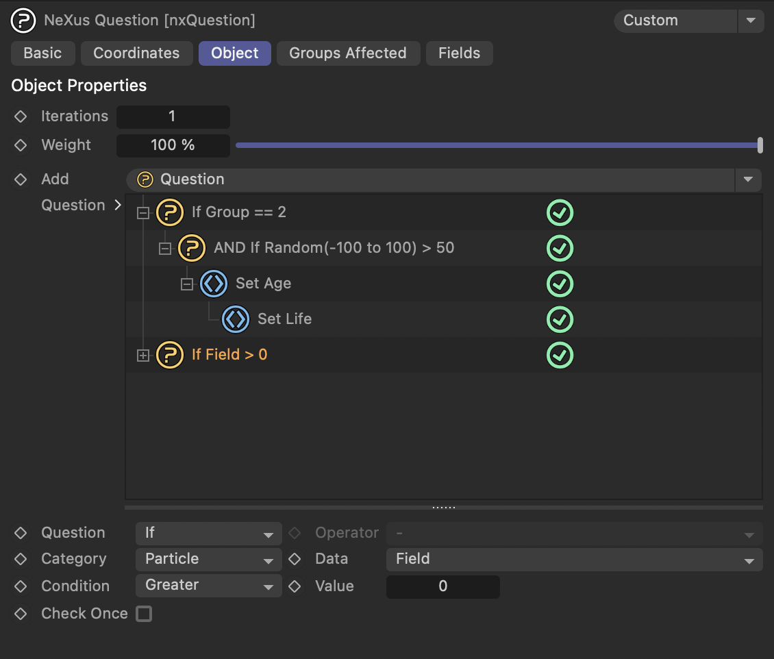 2. **nxQuestion**: 필드 탭에서 애니메이션된 구형 필드를 드래그하여 추가합니다. 객체 탭에서 입자가 필드 내부에 있을 때 그룹 2로 이동하도록 설정합니다.