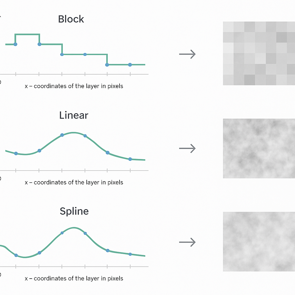 • Noise Type(노이즈 타입): 프랙탈의 시각적 형태를 결정하는 출력 장치로, Block(블록), Linear(선형), Soft Linear(부드러운 선형), Spline(스플라인)의 네 가지 타입이 있습니다.