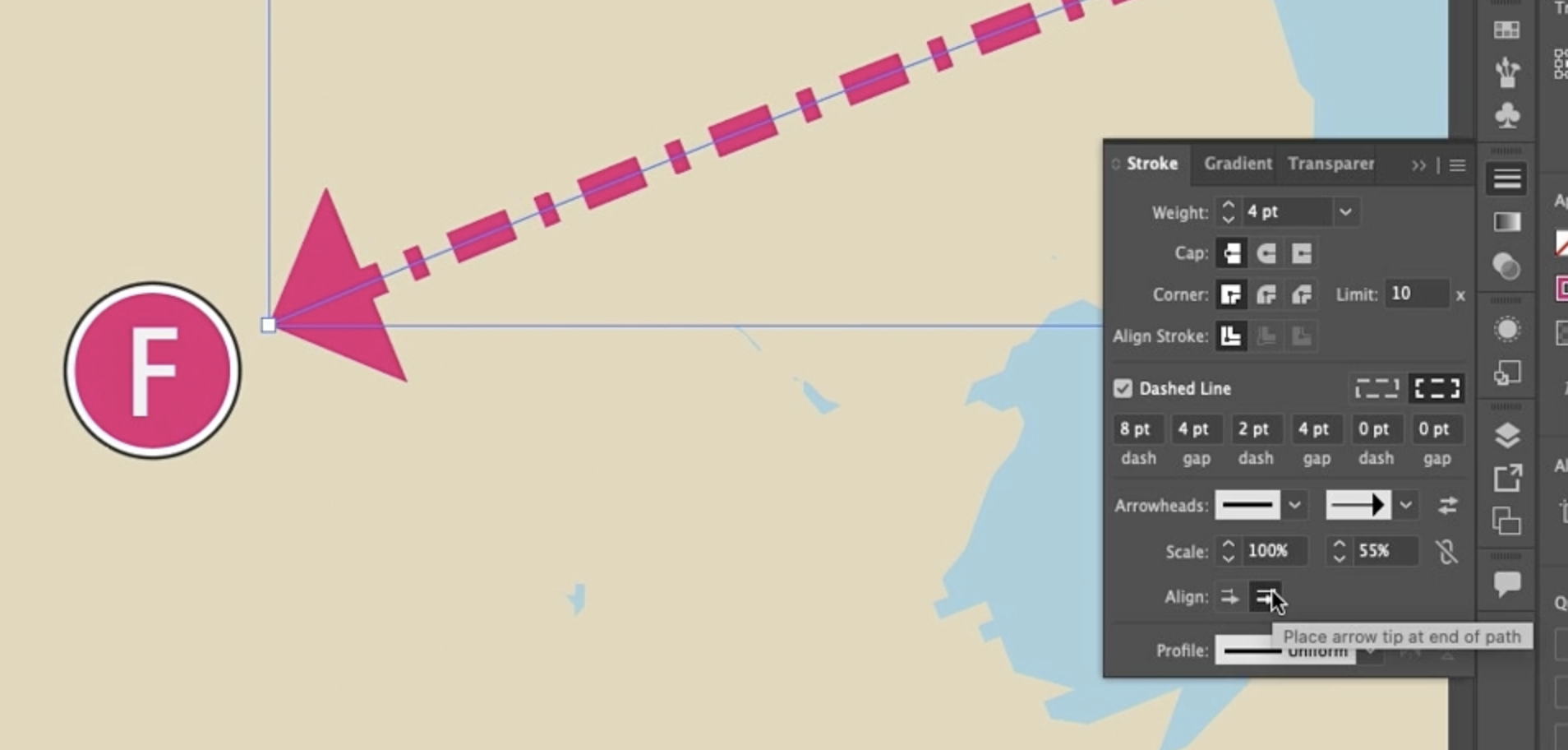 다시 Stroke 패널로 가서, **Arrowhead(화살표)**도 추가해 봅니다. 원하는 모양의 화살표 (예: Arrow 8)를 선택하면 됩니다. 화살표는 선이 그려진 방향을 따릅니다. 방향이 반대일 경우에는 방향 전환 버튼을 눌러 쉽게 바꿀 수 있습니다.