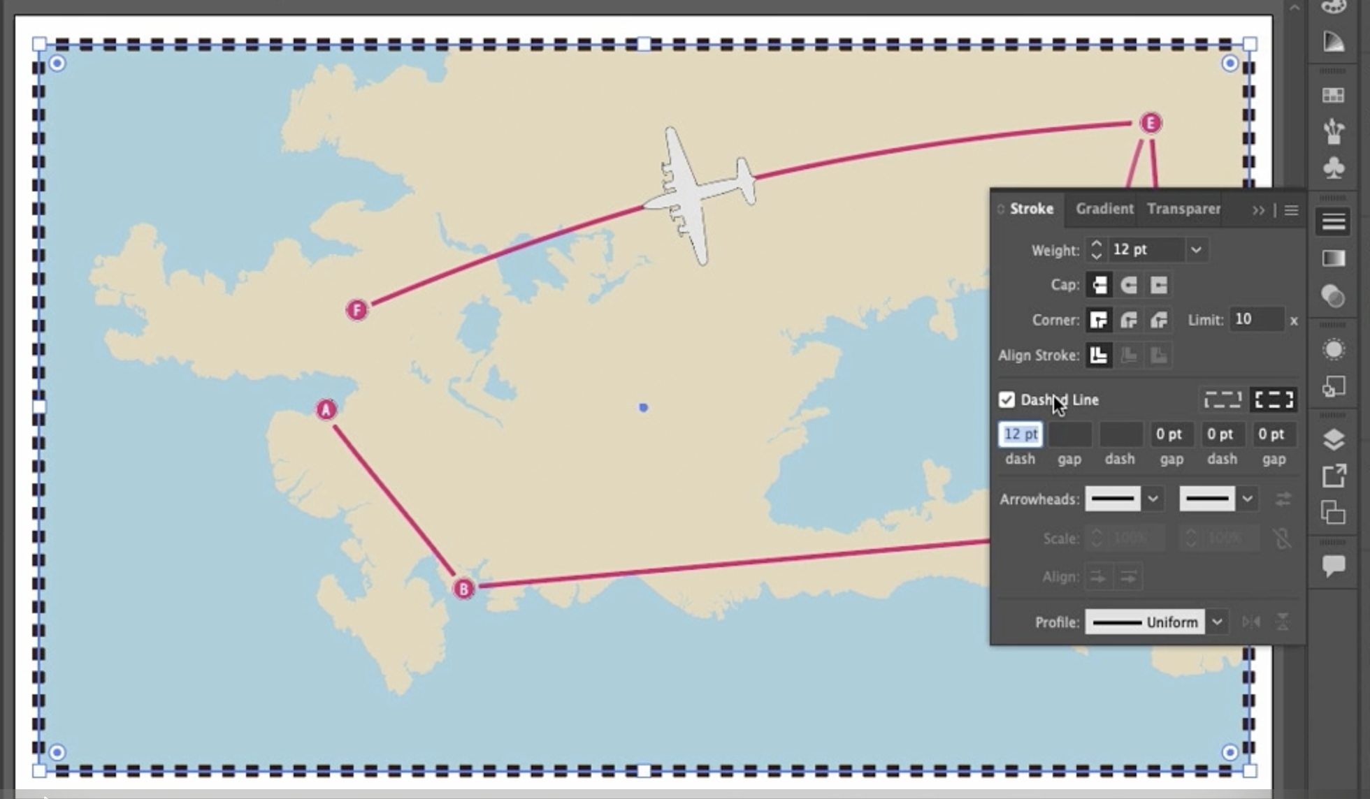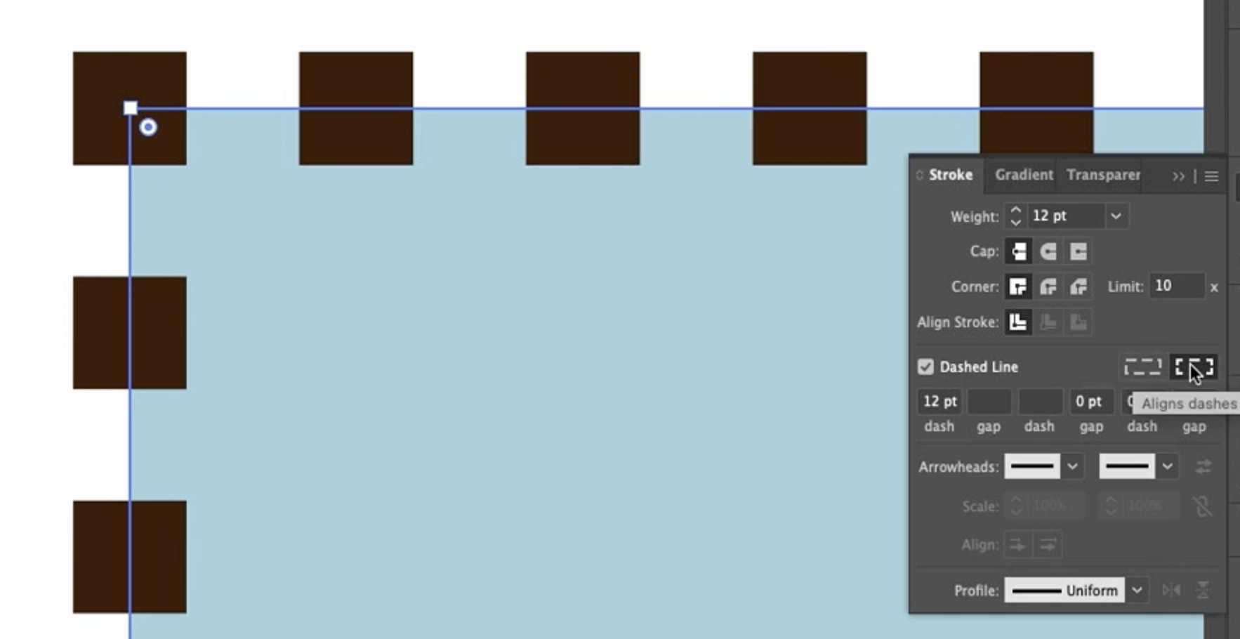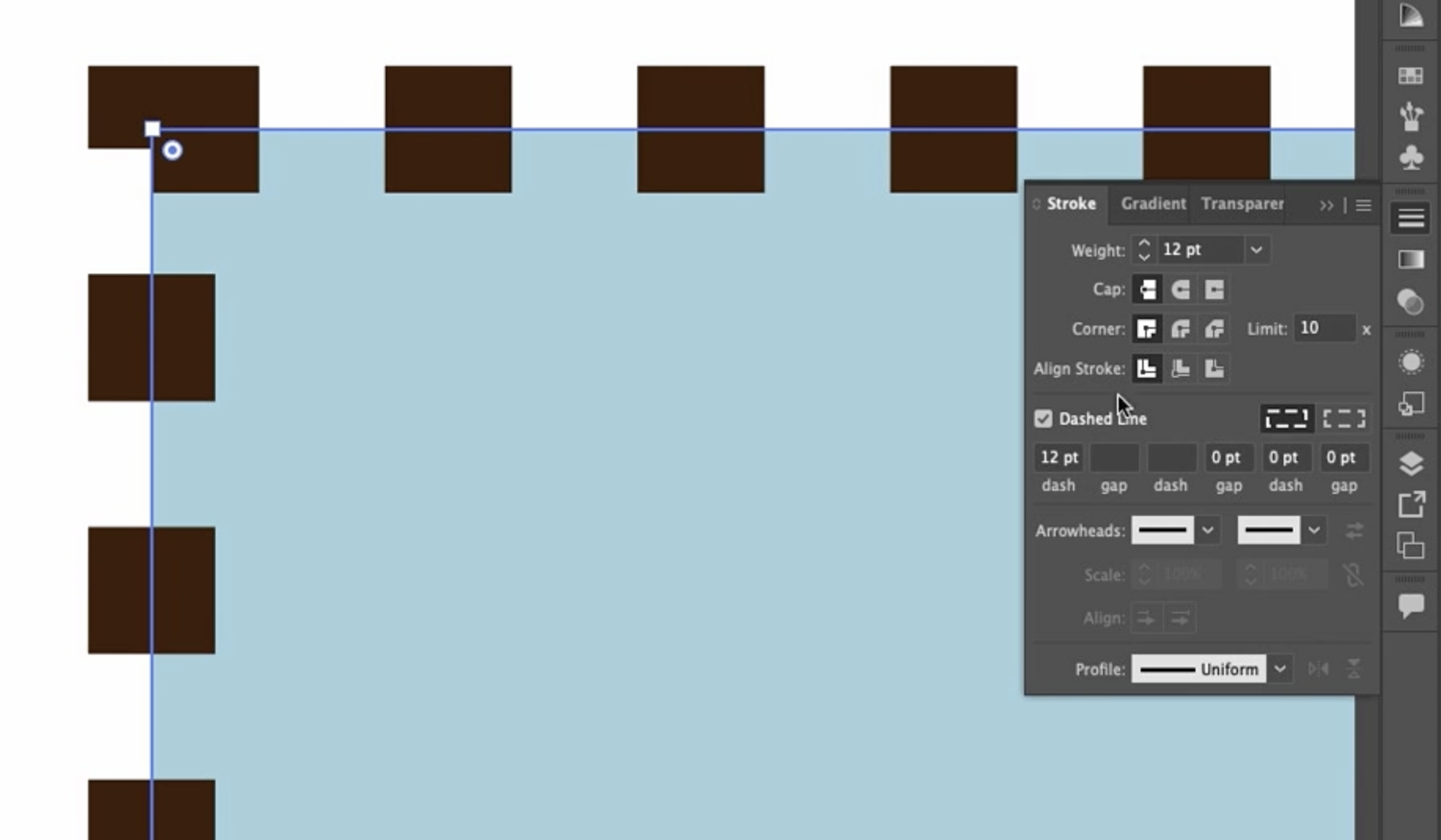 이를 살펴보기 위해, 지금부터 외곽선(stroke)에 대시선을 추가해 보겠습니다. Stroke 패널로 가서 Dashed Line을 체크하면 바로 대시선이 적용됩니다.