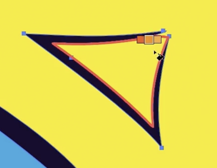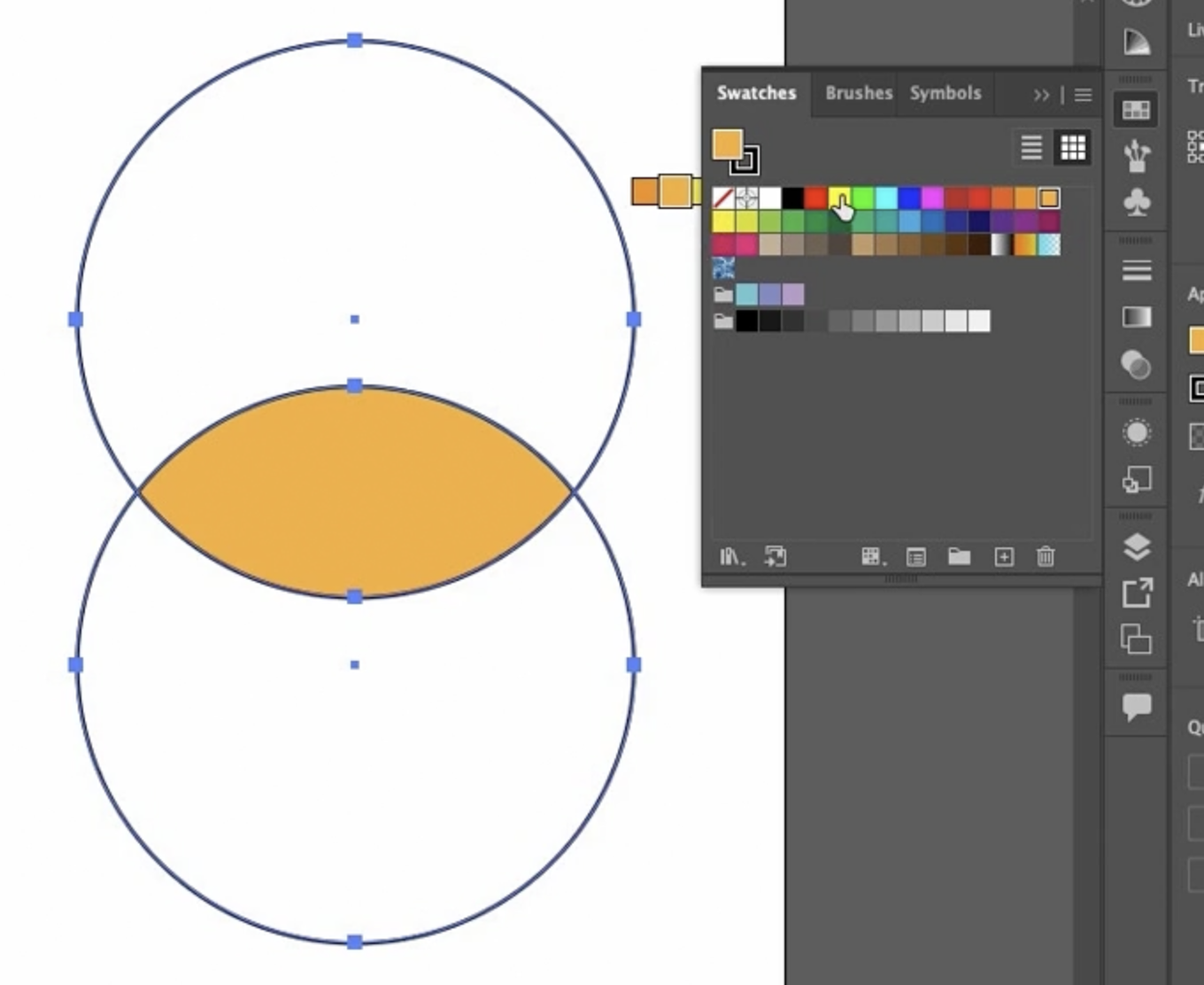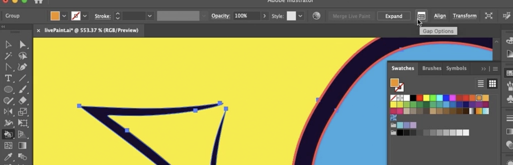 Swatches(견본) 패널을 열어 오렌지색을 선택하고 가운데 영역을 클릭합니다. Live Paint Bucket은 **영역(sector)**을 식별하여 하이라이트를 표시합니다. 아래쪽은 노란색, 위쪽은 빨간색으로 칠합니다. 마치 그림을 그리는 것처럼 빨간색과 노란색이 합쳐져 오렌지색이 되는 것과 같습니다.