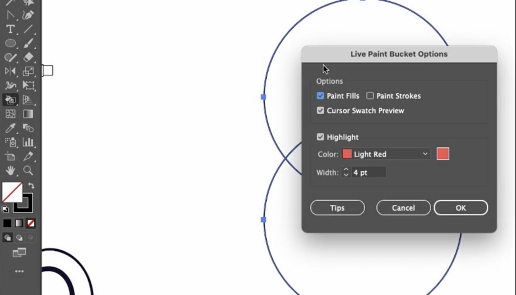두 개의 원을 선택하고 **Object(객체) > Live Paint(라이브 페인트) > Make(만들기)**를 선택하거나 단축키 **Option-Command-X (Windows에서는 Alt-Control-X)**를 눌러 라이브 페인트 그룹으로 만듭니다. 라이브 페인트 그룹은 바운딩 박스의 모서리에 작은 표시가 있으며, Control 스트립과 Properties 패널에서도 'Live Paint'라는 단어를 확인할 수 있습니다.