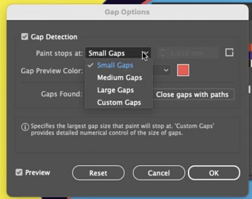이 간격을 처리하려면 **Gap Options(간격 옵션)**를 사용합니다. Control 스트립이나 Properties 패널에서 Gap Options를 클릭합니다. **Gap Detection(간격 감지)**이 이미 켜져 있을 수 있습니다. **Paint stops at medium gaps(중간 간격에서 칠 멈추기)**를 선택합니다. 이제 간격이 식별됩니다. Large gaps(큰 간격) 옵션도 있습니다. 'Medium'을 선택하고 'OK'를 클릭합니다. Live Paint Bucket을 선택한 다음 키보드에서 슬래시(/) 키를 눌러 **Fill of None(칠 없음)**을 적용하고 간격을 클릭합니다. 그러면 간격이 처리됩니다.