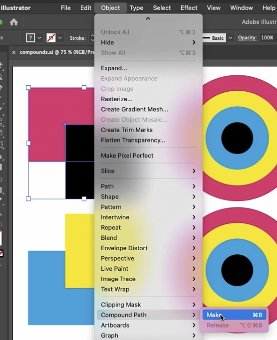 이 세 도형을 복합 패스로 만들기 위해 다시 Object → Compound Path → Make를 선택하세요.