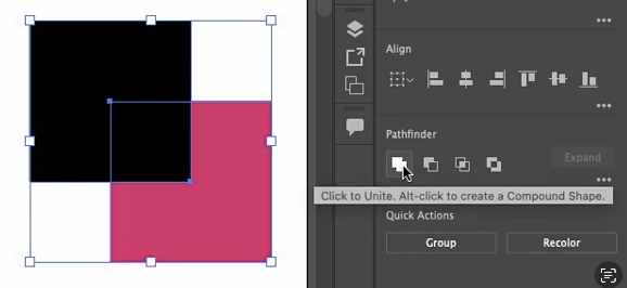 오른쪽 위의 두 개 정사각형을 선택하고, Properties 패널의 Shape Modes에서 첫 번째 버튼을 클릭하세요.