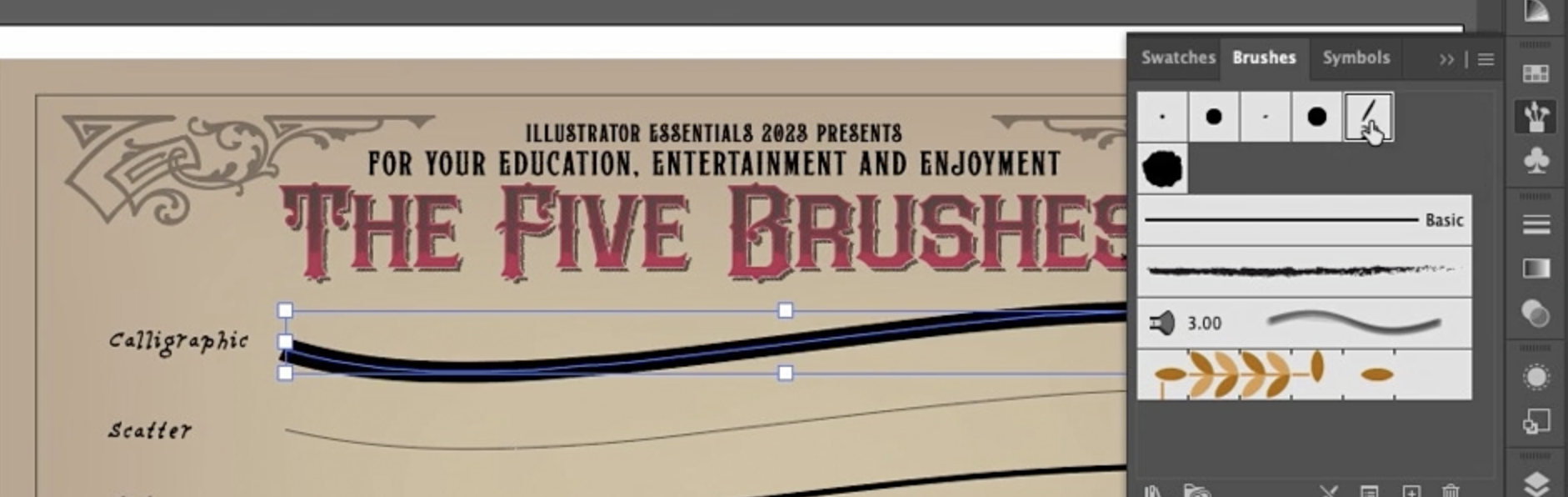 어쨌든, 이 선에 몇 가지 브러시 효과를 적용해 봅시다. 캘리그래피 옆에 있는 첫 번째 선을 클릭하면, 브러시 패널의 오른쪽 상단에 캘리그래피 브러시가 있습니다. '30포인트 플랫'이라고 되어 있습니다. 그것을 클릭한 다음 선에서 멀리 떨어진 곳을 클릭하면 어떻게 적용되었는지 볼 수 있습니다. 각도를 확인할 수 있습니다. 수직에 가까워질수록 더 좁아지고, 수평으로 돌아갈수록 다시 두꺼워집니다. 사실, 제가 조금 스크롤 하면 더 명확하게 볼 수 있을 겁니다.