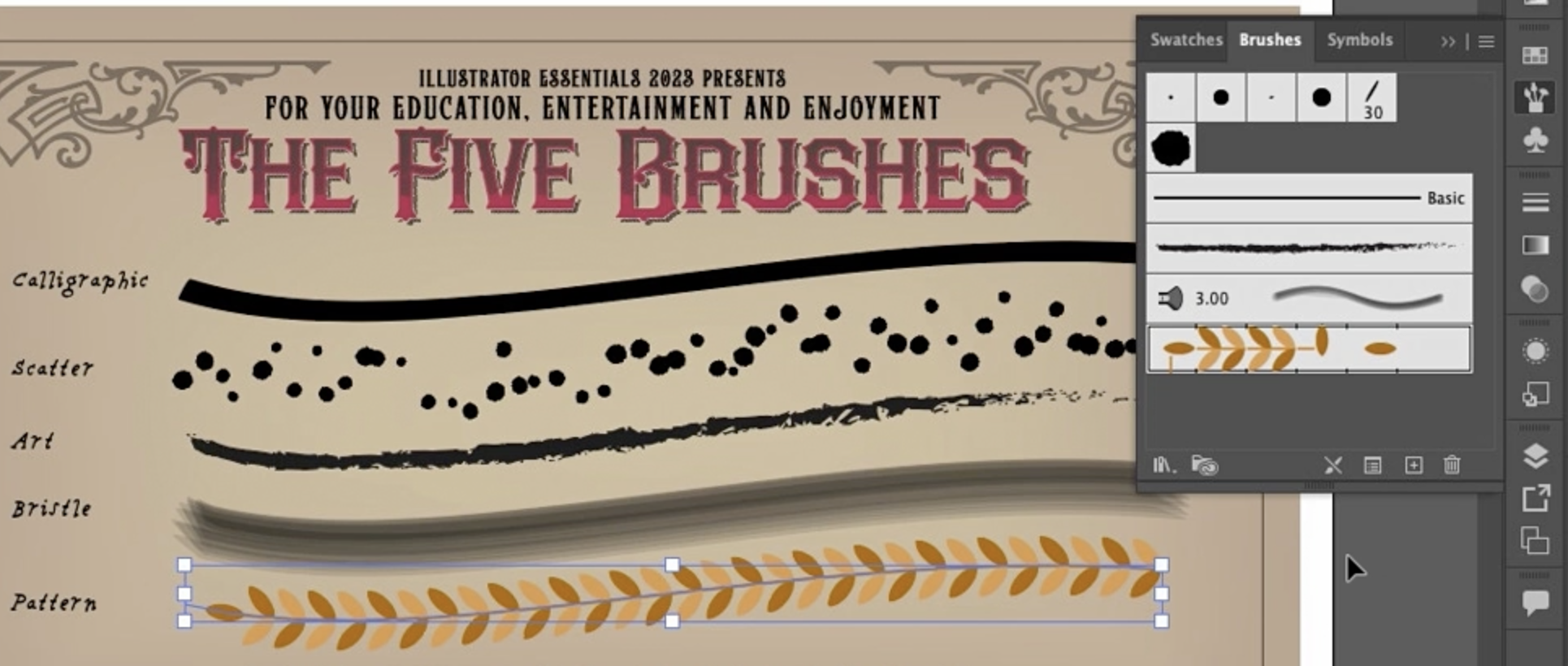 마지막으로 패턴 브러시가 있습니다. 이것은 다음 챕터에서 경험하게 될 것입니다. 다시 말하지만, 편안한 시청을 위해 크기를 자유롭게 늘리세요. 하지만 이것은 매우 흥미로운 형태의 브러시입니다. 저는 이것을 사용하여 온갖 종류의 것을 그립니다. 만약 이 영상을 순차적으로 시청했다면, 내비게이션과 모든 파이프 작업을 다루는 맨 처음 영상에서 모든 파이프가 일러스트레이터 브러시입니다. 저는 그 그림을 만들고 나서 이렇게 패턴 브러시로 만들었습니다.