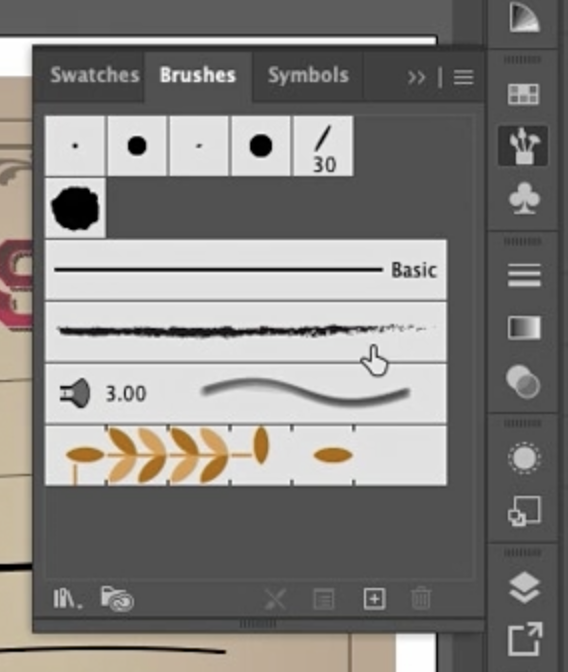 저는 이 문서의 브러시 패널을 우리가 사용할 브러시로 채워 넣었습니다. '기본'과 같은 몇몇 브러시는 어떤 패널에도 나타나며, 실제로 삭제할 수 없는 브러시입니다. 또한, 여기에 온 김에 언급할 가치가 있는 것은, 이 패널이 견본 및 심볼처럼 로더를 가지고 있다는 점입니다. 로더는 더 많은 유형의 항목을 가져올 수 있는 곳입니다. 따라서 더 많은 브러시를 원한다면 하단의 로더로 이동할 수 있습니다. 거기에 브러시 라이브러리 메뉴라고 되어 있지만, 로더가 더 일반적인 용어입니다. 로더를 클릭하면 다른 브러시를 로드할 수 있으며, 하단의 '다른 라이브러리'를 선택하여 자신의 다른 일러스트레이터 문서에 저장된 브러시도 포함할 수 있습니다.