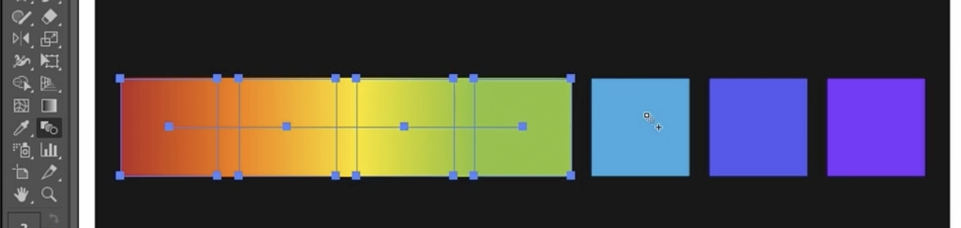 블렌드 도구를 사용해 보겠습니다. 키보드에서 W를 누르면 블렌드 도구가 활성화됩니다. 아트보드 왼쪽에 있는 빨간색 사각형으로 가서 클릭한 다음 주황색 사각형을 클릭합니다. 두 도형 사이의 색상이 블렌딩되는 것을 볼 수 있습니다. 이제 노란색 사각형을 클릭하고 순서대로 각 사각형을 클릭하여 지나갑니다. 도형들 사이에 부드러운 블렌드가 만들어진 것을 확인할 수 있습니다.