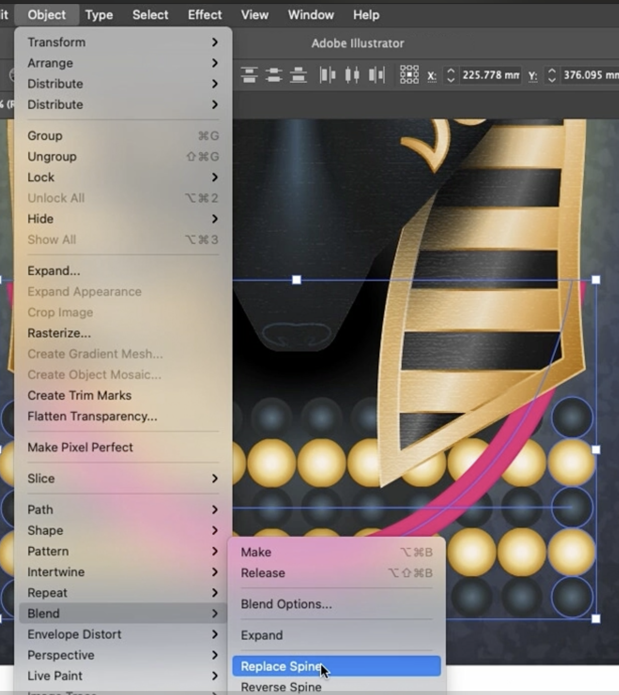 여기에 블렌드와 블렌드 스파인이 있습니다. 또한 큰 자홍색 패스가 있습니다. Shift를 누른 채 클릭하여 그것도 선택합니다. 그런 다음 오브젝트 메뉴로 이동하여 블렌드를 선택하고 스파인 교체를 선택합니다. 여기에는 스파인 반전 및 앞뒤 반전과 같은 다른 명령도 있으니 나중에 직접 탐색할 때 사용해 보세요.
