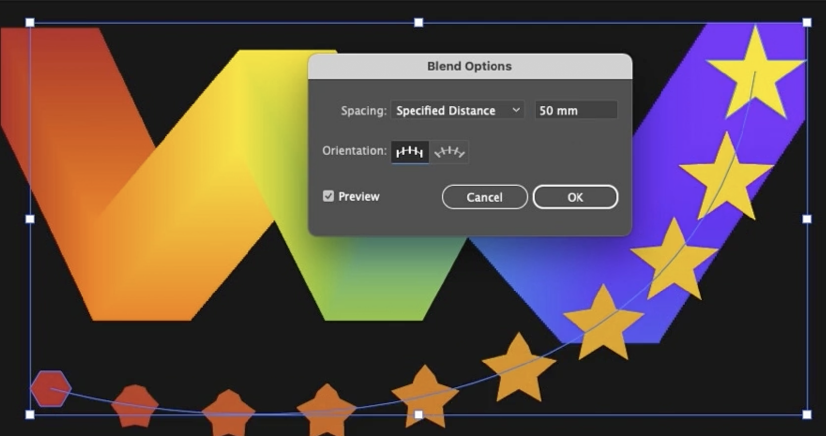 아래에 있는 두 도형으로 훨씬 더 역동적인 작업을 해보겠습니다. 다시 W를 눌러 블렌드 도구를 활성화합니다. 빨간색 육각형을 클릭한 다음 노란색 별을 클릭합니다. 이제 두 가지 일이 동시에 일어나고 있습니다. 색상뿐만 아니라 도형 사이에도 블렌드가 발생합니다. A를 눌러 직접 선택 도구를 활성화하고, 클릭하여 선택을 해제한 다음 다시 별을 클릭합니다. 별을 아트보드의 다른 곳으로 이동합니다.