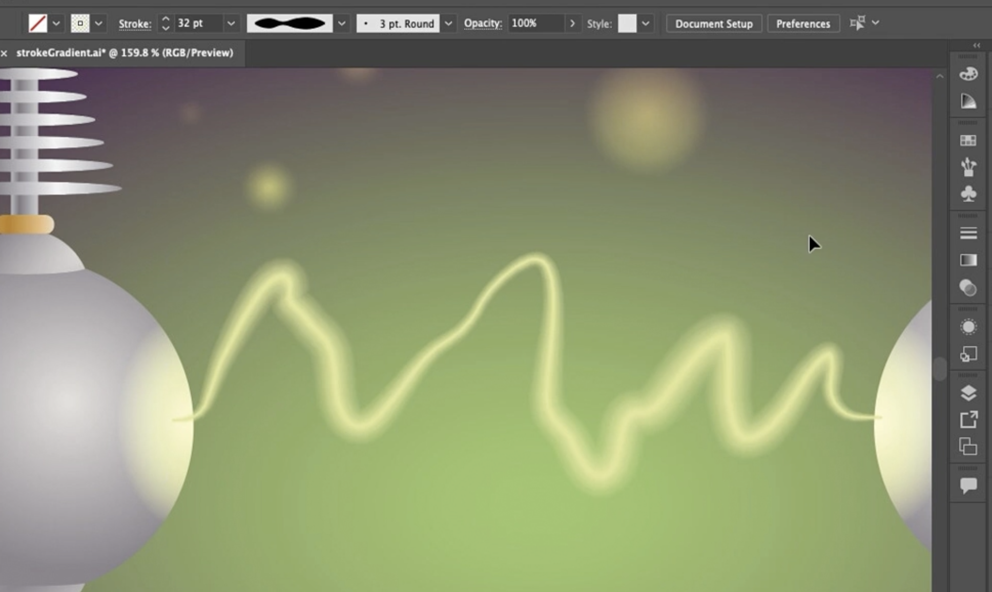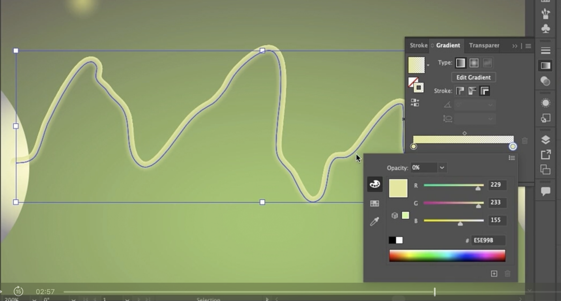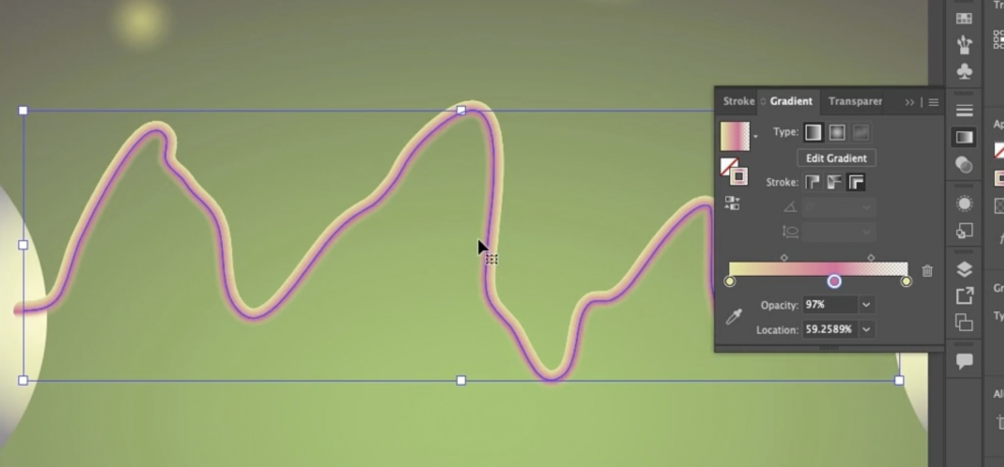 우리는 **선(Stroke)**에도 **그라디언트(Gradient)**를 적용할 수 있습니다. 지금 작업 중인 파일에서 이 선을 선택하고 그라디언트를 적용하는 방법을 살펴보겠습니다.