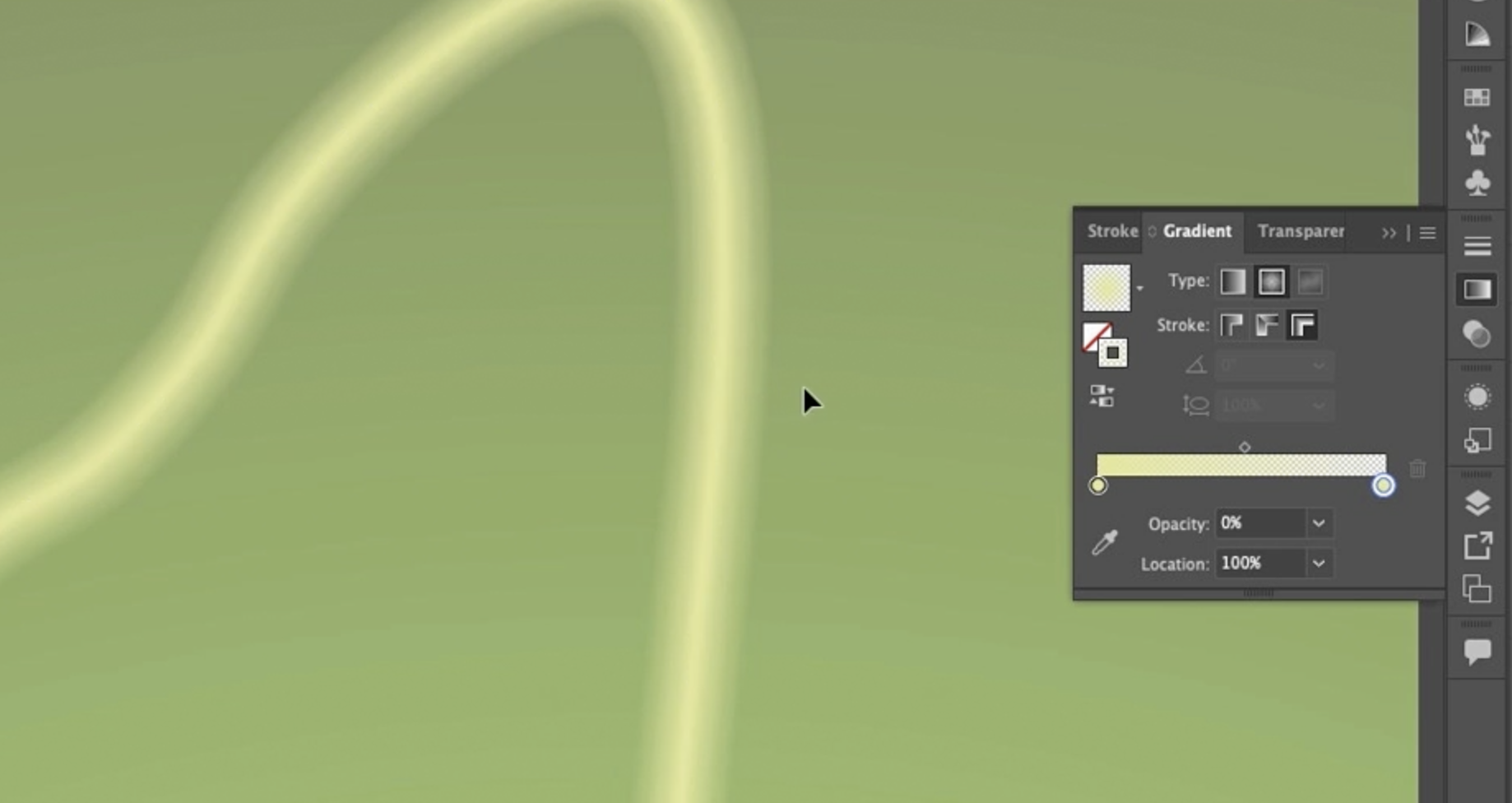 보기 편하시도록 화면을 더 확대해보면, 한쪽은 100% 불투명도에서 시작해서, 다른 쪽은 0%로 사라지는 효과를 정확히 확인할 수 있습니다. 이처럼 그라디언트를 스트로크에 적용하는 것만으로도 다양한 창의적 가능성이 열립니다.