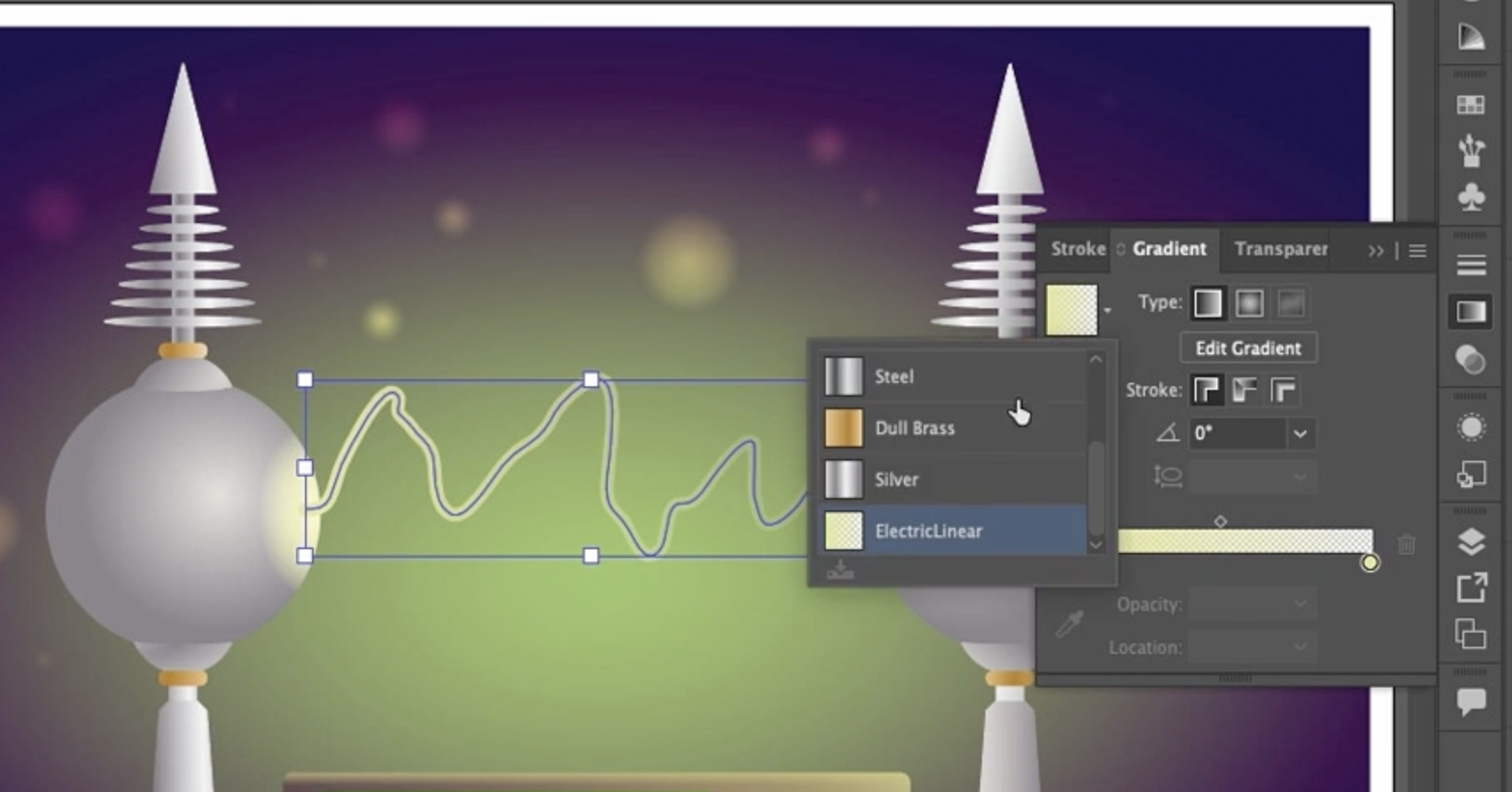 제가 사용한 그라디언트를 적용하려면, **그라디언트 선택기(Gradient Selector)**를 클릭해서 빠르게 접근하고 **‘Electric Linear’**를 선택하세요.