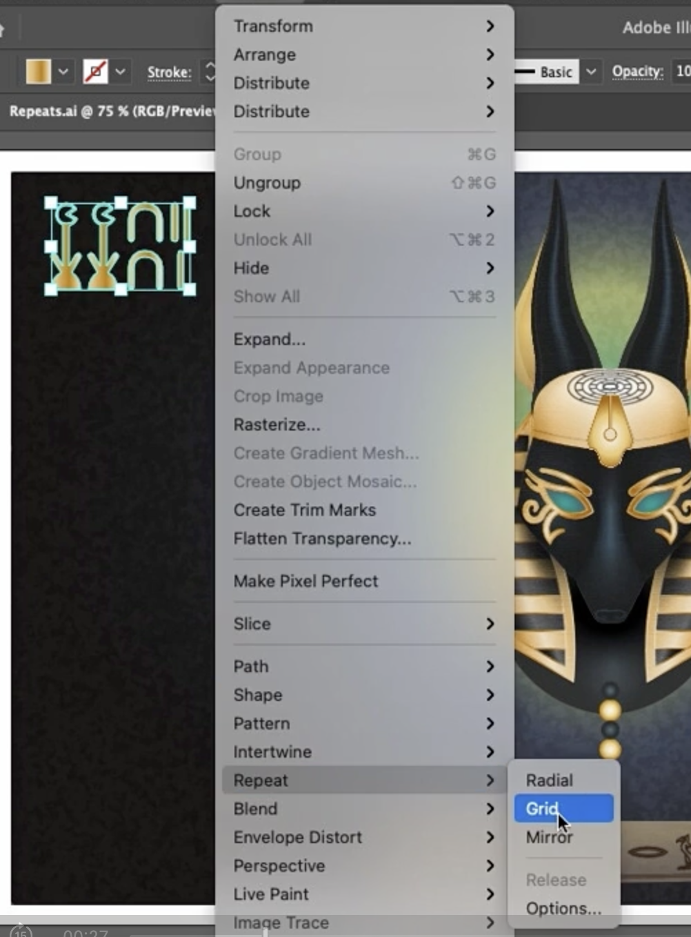 Illustrator에는 요소를 반복하고 싶을 때 매우 유용하게 사용할 수 있는 세 가지 반복 효과가 있습니다. 이 효과들은 몇 년 전에 추가되었으며, 지금부터 이 세 가지를 모두 살펴보겠습니다. 먼저, 모서리에 있는 그래픽을 사용하여 그래픽의 그리드 배열을 만드는 것부터 시작하겠습니다.