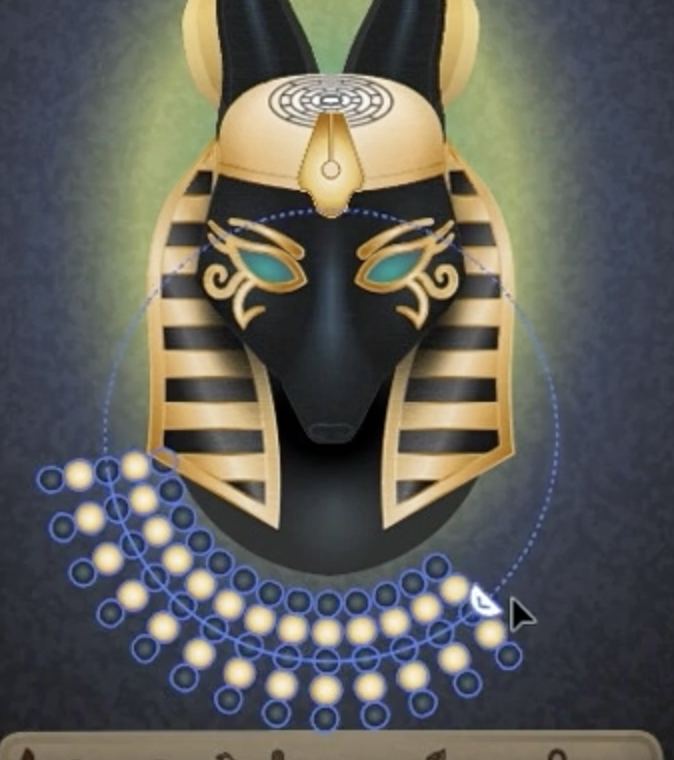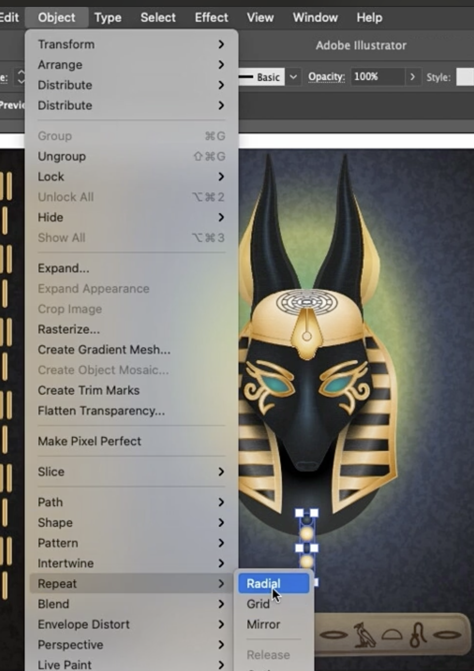 마지막으로, 이 그룹을 선택하여 **방사형 반복(Radial Repeat)**을 만들 것입니다. 개체 메뉴로 이동하여 **반복(Repeat)**을 선택하고 **방사형(Radial)**을 선택하면 이와 같이 나타납니다. 다른 위치로 드래그하거나, 저처럼 키보드의 화살표 키를 사용하여 이동할 수 있습니다. Shift 키를 누르고 있으면 좀 더 빠르게 이동할 수 있습니다. 상단의 위젯, 즉 방사형 반복의 반지름을 변경할 수 있는 큰 원을 잡겠습니다. 이렇게 밖으로 당겨서 양쪽에 있는 것들이 어깨가 있어야 할 위치와 일치하도록 하는 것이 목표입니다. 그리고 위로 조금 더 올리겠습니다. 이 정도면 만족합니다.