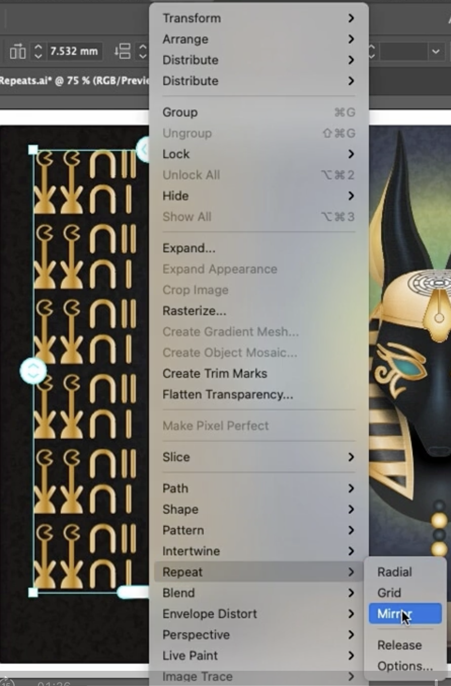 또한 반복을 중첩할 수도 있습니다. 한 종류의 반복을 추가하고 다른 종류의 반복과 결합할 수 있습니다. 여기서 그렇게 해보겠습니다. 개체 메뉴로 이동하여 **반복(Repeat)**을 선택하고 이번에는 미러(Mirror) 옵션을 선택합니다. 이제 점선이 나타나고, 반복을 이동하려면 양쪽 끝의 위젯이 아니라 반복 바로 아래에 있는 위젯을 사용해야 합니다. 보시다시피 이 위젯을 당기면 그래픽 세트가 미러링됩니다. 가운데에 놓겠습니다. 반드시 직선으로 미러링할 필요는 없습니다. 원한다면 각도를 사용해도 됩니다. 즉, 대칭 평면을 제공합니다. 지금은 한쪽으로 설정했지만, 속성 패널에서 다시 가운데로 드래그할 필요 없이 90도로 설정할 수 있습니다. 현재 격리 모드에 있으므로 미러 반복을 위해 이중 클릭하여 나갑니다.