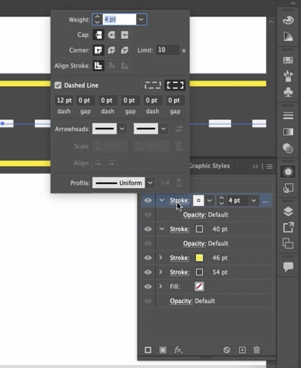 그 위에는 40포인트 두께의 회색 선을 추가했습니다. 16포인트 차이가 있는 것을 보실 수 있습니다. 그리고 그 위에 4포인트 두께의 선을 추가했습니다. 하지만 대시선을 활성화했고, 원하는 만큼 길게 만들 수 있습니다. 그리고 부드러운 선을 위해 설정되어 있어서 어떤 것도 잘 처리할 수 있을 겁니다. 잠시 후에 알게 되겠지만요.