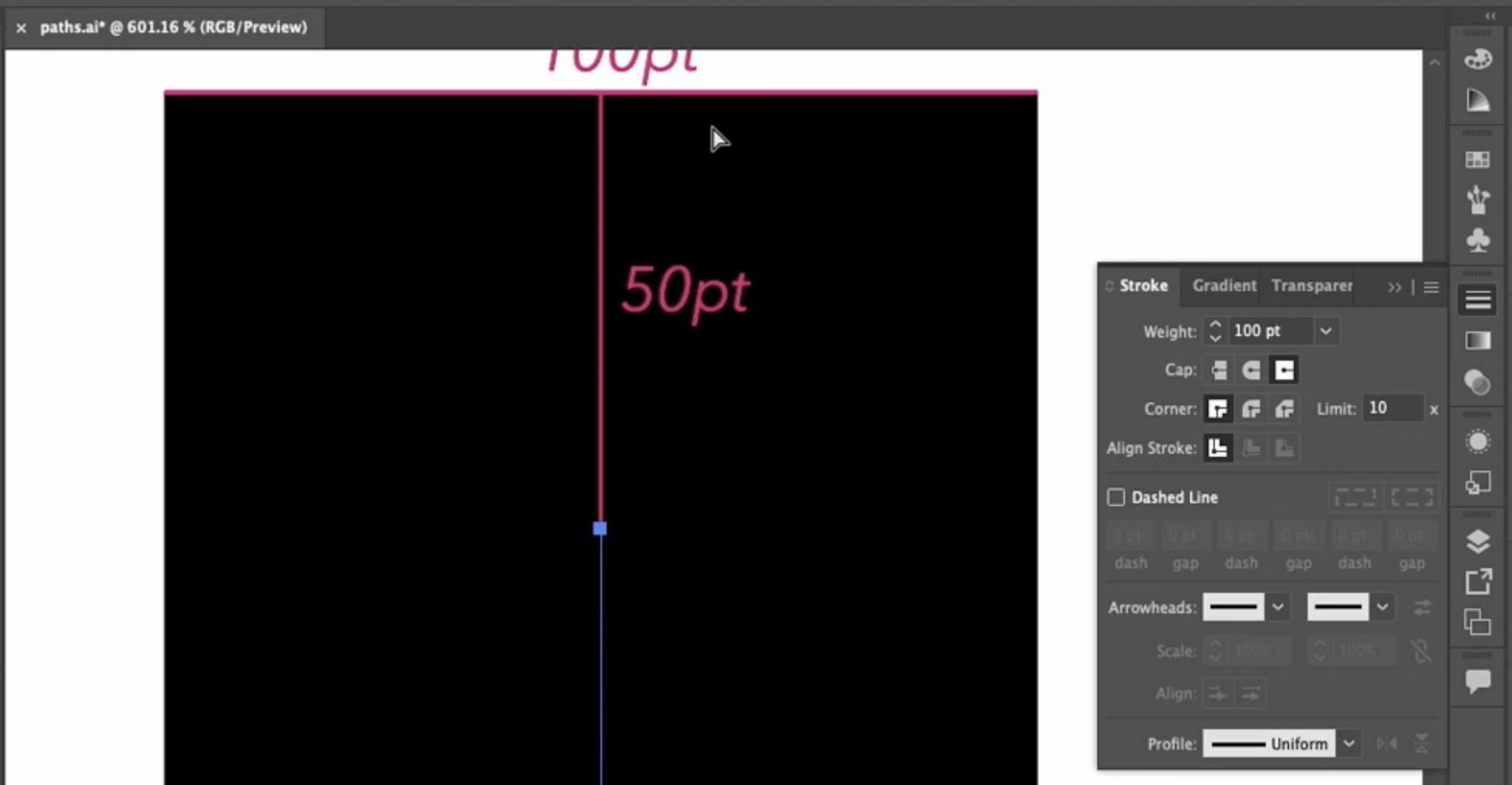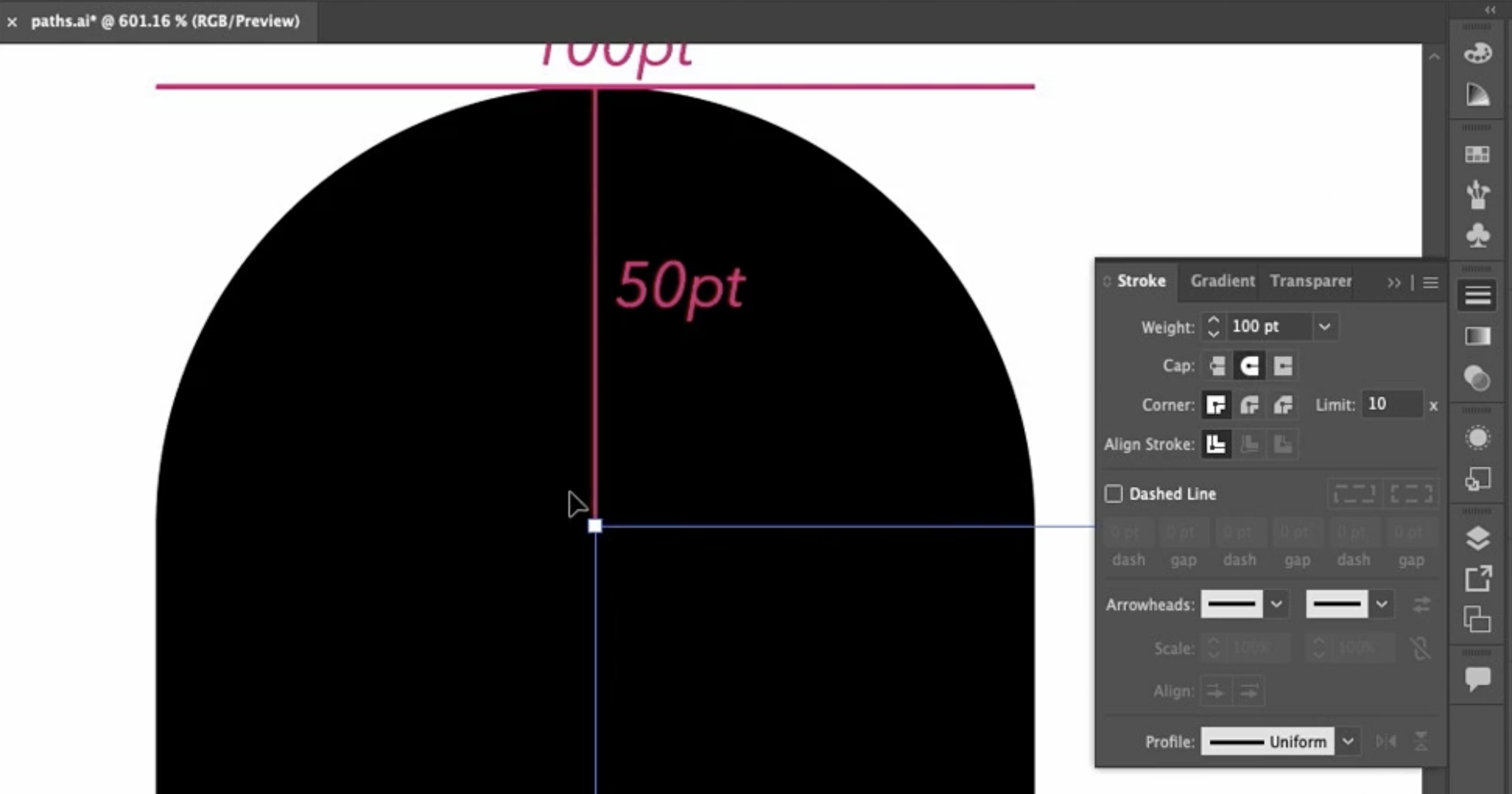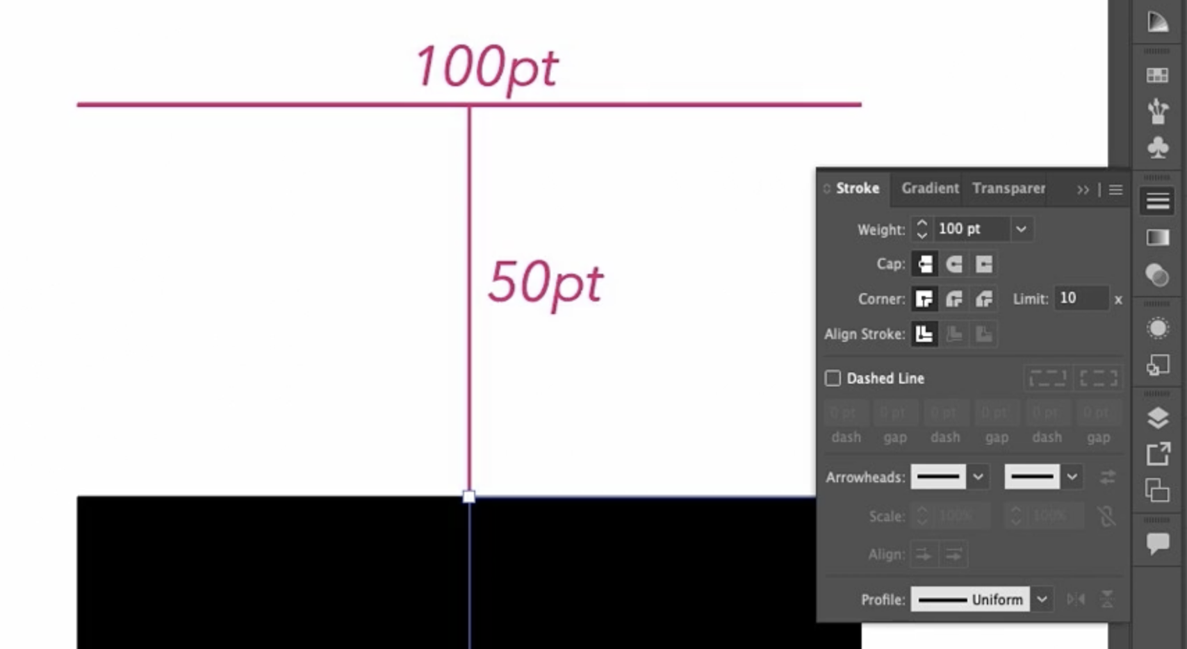 이 스트로크는 굵기(weight) 가 100pt 입니다. 패널에서도 확인할 수 있죠. 100pt의 절반은 50pt이고, 제가 이 아래쪽에 그 거리를 표시해 두었습니다. 이건 끝 모양(End Cap) 을 이해하는 데 도움이 됩니다.