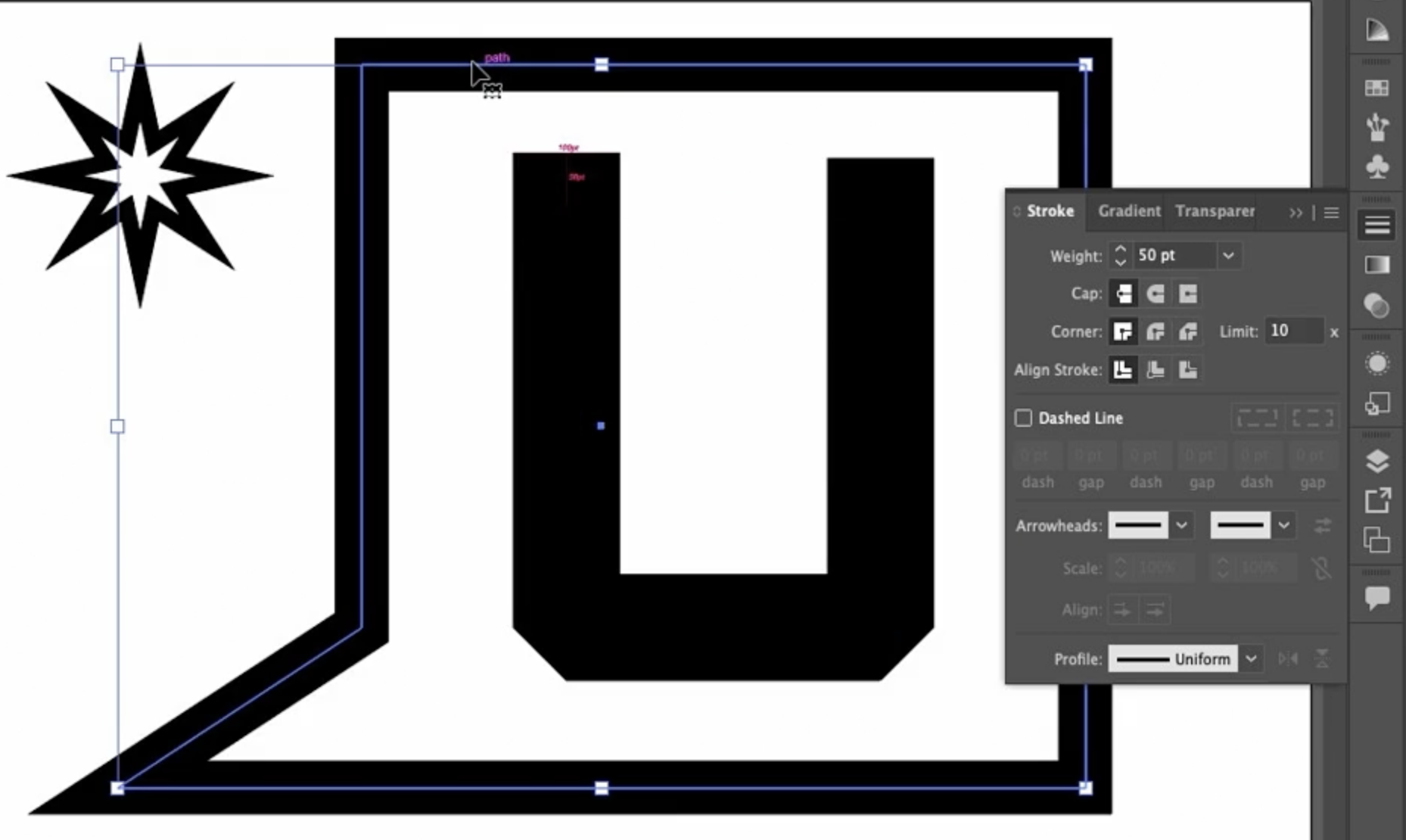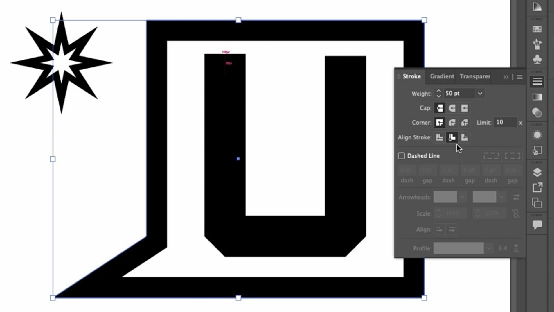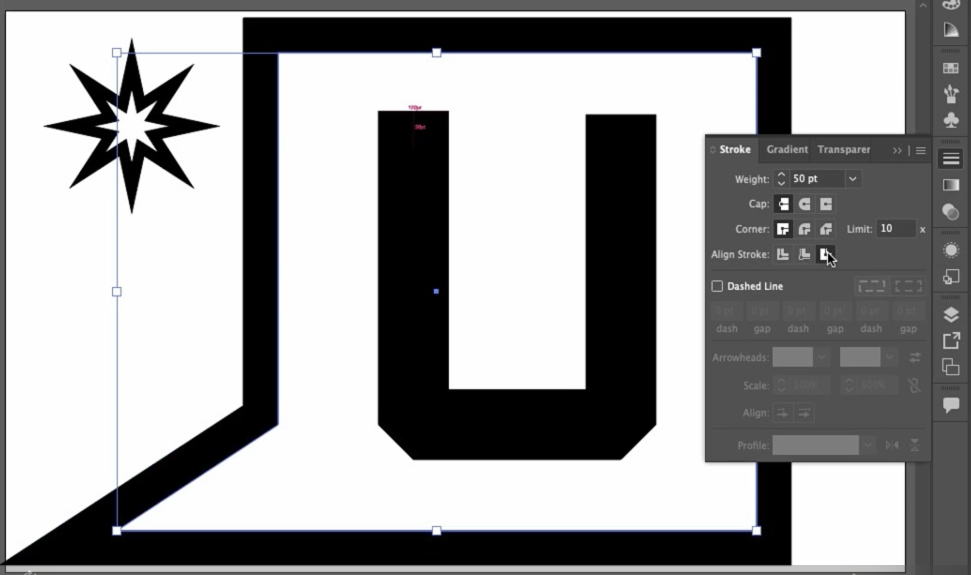이 스트로크는 굵기(weight) 가 100pt 입니다. 패널에서도 확인할 수 있죠. 100pt의 절반은 50pt이고, 제가 이 아래쪽에 그 거리를 표시해 두었습니다. 이건 끝 모양(End Cap) 을 이해하는 데 도움이 됩니다.