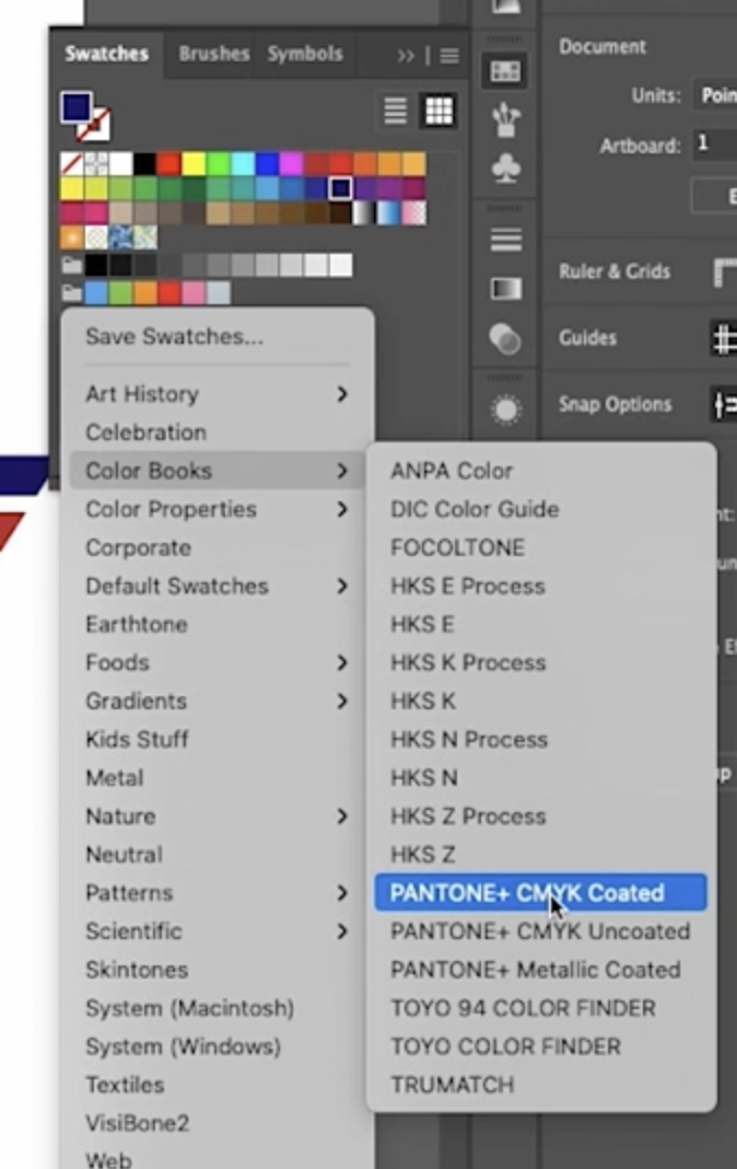 지금 Swatches 패널을 열고 아래쪽의 로더(Loader) 아이콘을 눌러보면, Color Books 안에 여러 가지 색상 라이브러리가 있다는 것을 볼 수 있습니다. 그런데 여러분이 이 영상을 보게 될 시점쯤에는, 아마도 Pantone 색상은 사라졌을 수도 있습니다. Adobe 제품에서의 지원이 종료되었기 때문이죠. 원래 Pantone 색상은 Adobe가 라이선스를 받아 제공하던 것이지만, Pantone 측에서 자체 앱을 통해 색상을 제공하기로 결정했기 때문에 그렇습니다.