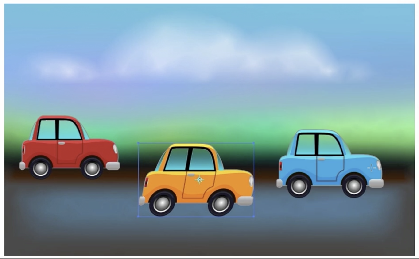 이제 심볼들을 크기 조절하거나 회전해볼 수도 있습니다. 가까이 있는 자동차는 조금 더 크게 만들어 봅시다. **Scale Tool(S 키)**을 눌러 조절할 수 있습니다.