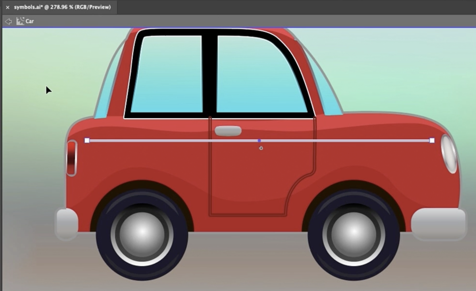 이제 심볼의 동적 기능을 살펴보겠습니다. A 키를 눌러 Direct Selection Tool을 선택하고, 자동차 내부의 빨간 부분을 클릭한 뒤, 색상을 변경해 봅시다. 또 다른 인스턴스에서도 같은 작업을 해보세요.