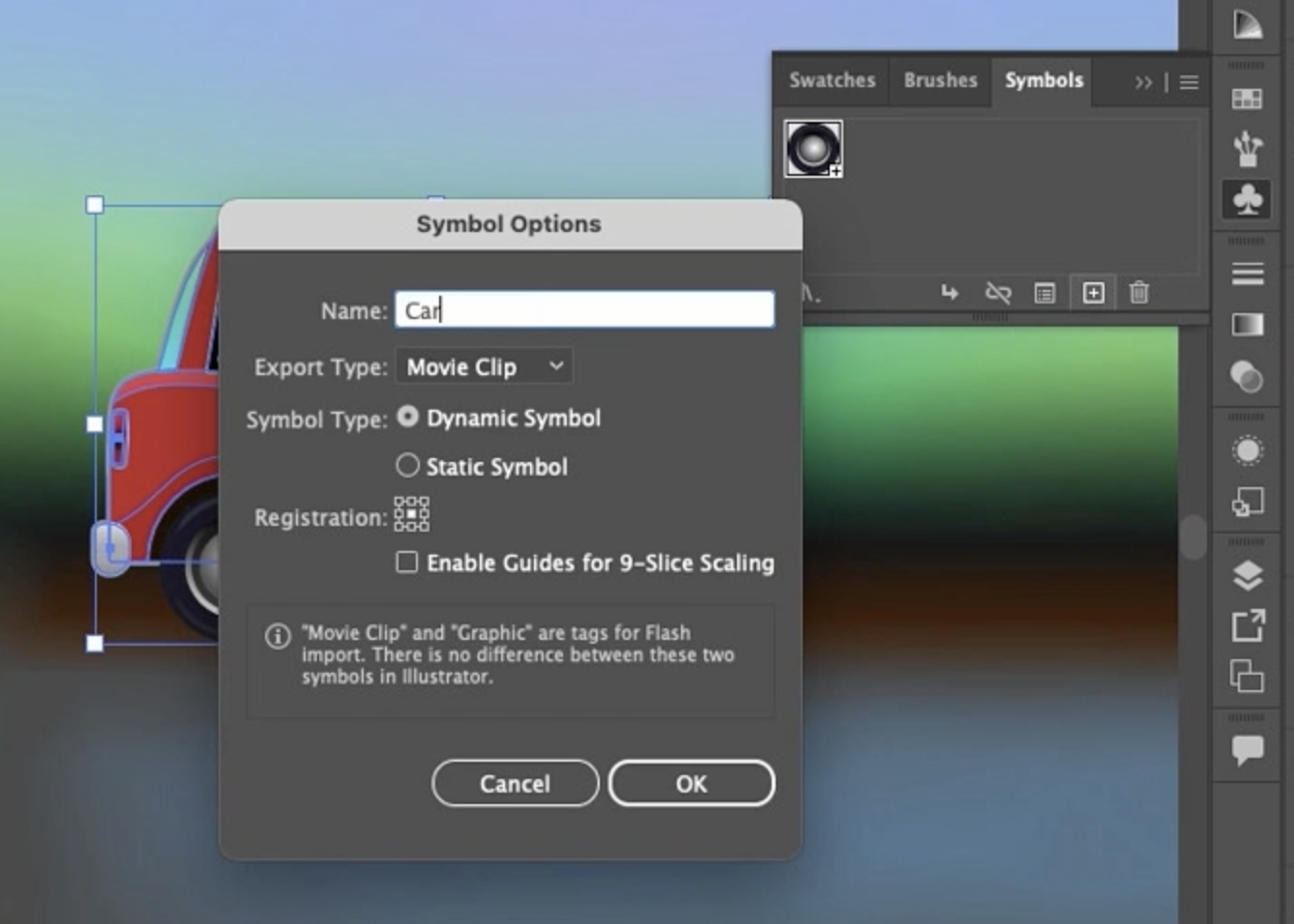 이제 이 두 개의 심볼 인스턴스와 자동차 오브젝트를 함께 선택해서 하나의 심볼로 만들어 보겠습니다. 심볼 패널 하단의 플러스 버튼을 클릭하면 새 심볼을 만들 수 있습니다. 이름은 car라고 하겠습니다. 나머지 설정은 대부분 무시해도 됩니다.