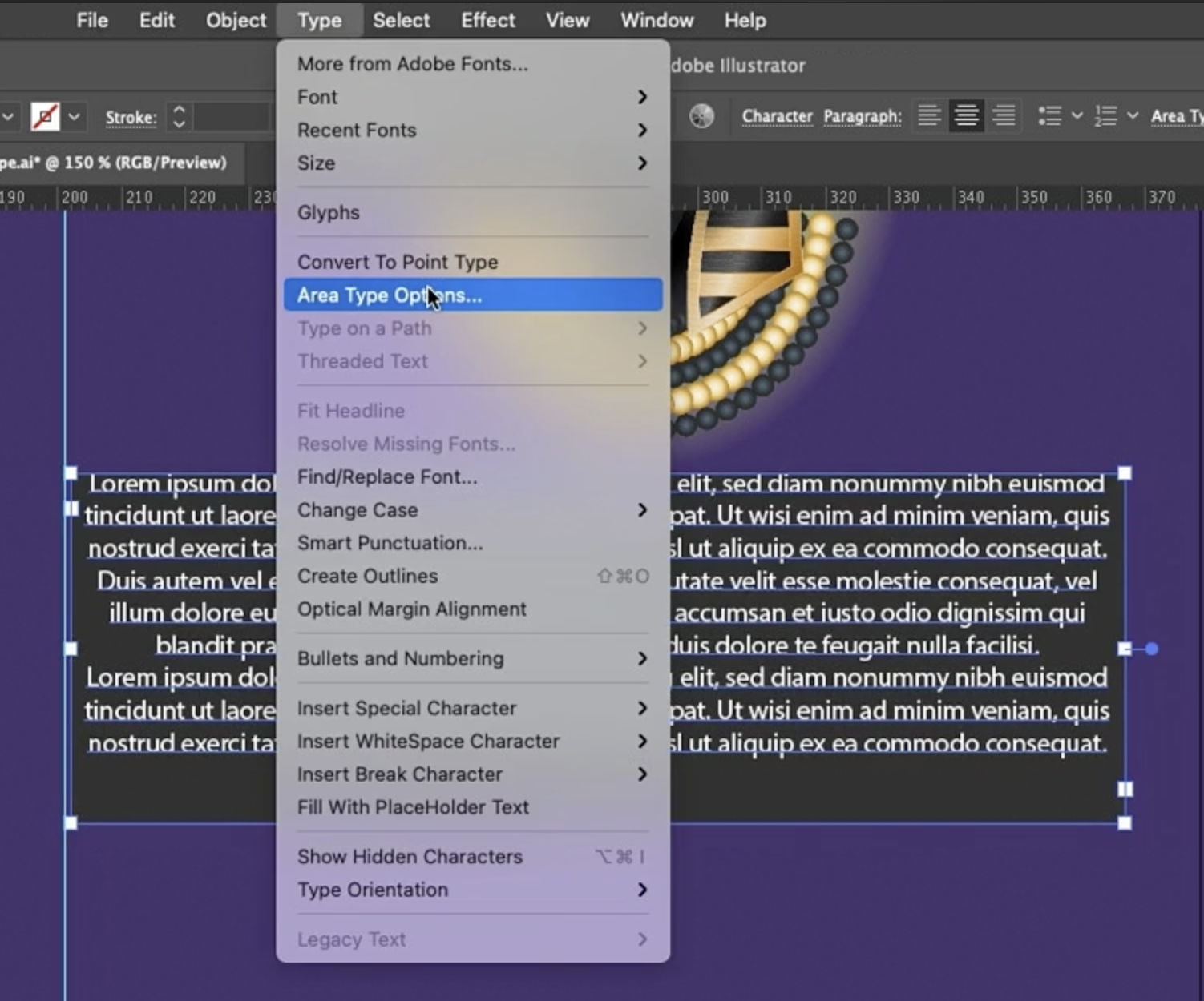하지만 텍스트 자체가 상단 가장자리에 너무 붙어 있어 이상적이지 않습니다. 상자를 좀 더 크게 만든 다음 문자(type) 메뉴로 이동하겠습니다. 제대로 선택되어 있다면(제가 다시 선택 도구로 선택했습니다), 문자(type) 메뉴로 가서 **영역 문자 옵션(area type options)**으로 이동하겠습니다.