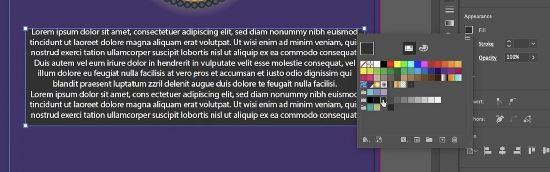 인디자인과 달리, 여기에서 **텍스트 상자(text box)**가 선택된 상태에서 **색상 견본 패널(swatches panel)**의 색상은 실제로 **텍스트(text)**를 나타냅니다. 색상이 변경되는 것을 볼 수 있습니다. 인디자인에서는 프레임이 변경되었을 것입니다. 하지만 이 두 가지는 별개입니다.
