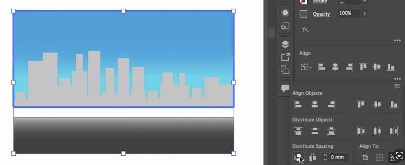 기준 오브젝트가 설정된 상태에서 수직 간격을 0으로 설정하면 두 오브젝트가 아래로 정렬됩니다.